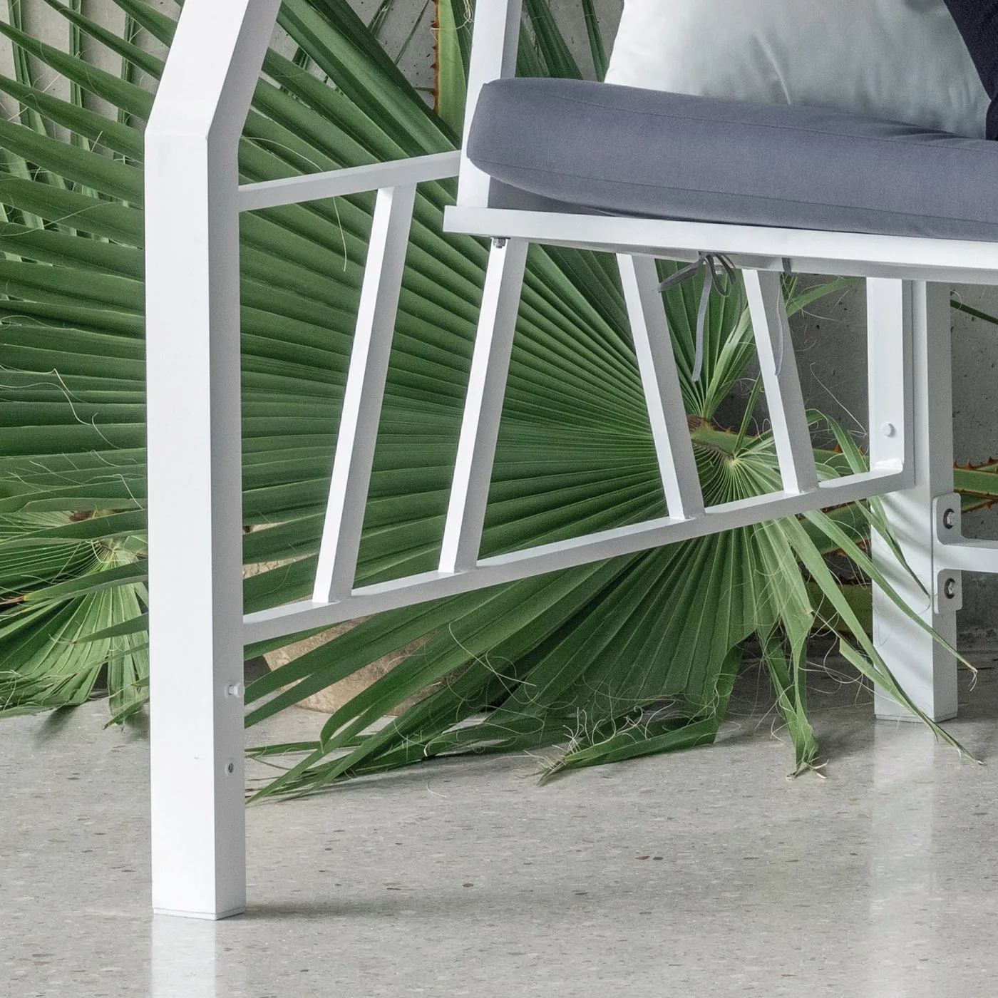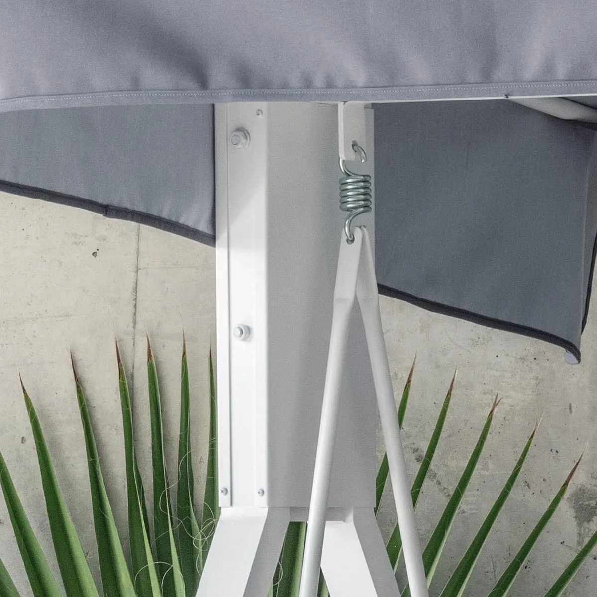 ¿Te imaginas relajarte en tu jardín mientras disfrutas del aire fresco y de un cómodo equilibrio? Nuestro balancín exterior para jardín es el lugar ideal para descansar, leer, tomar un café o simplemente disfrutar de la compañía de tus seres queridos. Es amplio y cómodo, con un asiento acolchado que te ofrecerá el máximo confort.El peso máximo que recomendamos para su uso es de 110 kg.Disfruta de un asiento cómodo y suave gracias a la tapicería Dralón que se adapta a tu cuerpo. El aluminio con el que está fabricado nuestro balancín de exterior no solo lo hace resistente y duradero, sino que también te brinda un estilo moderno y elegante que complementará perfectamente tu jardín.¿Te preocupa el mantenimiento? No te preocupes, nuestro sofá balancín de exterior blanco es fácil de limpiar y mantener gracias a los materiales de alta calidad con los que está fabricado.En la fabricación de este balancín de jardín, se han utilizado las mejores materias primas que la hacen muy resistente y duradera. Estructura y uniones fabricadas en aluminio extrusado de alta calidad y no reciclado. Los tubos de aluminio que la forman están perfectamente lijados para eliminar cualquier imperfección o irregularidad en las juntas. Así mismo, dichos tubos están especialmente pulidos para abrir los poros del aluminio y facilitar la fijación de la pintura. Las patas llevan tacos para evitar rallar el suelo y reducir el ruido producido con el movimiento. Fabricamos la estructura en cuatro colores distintos; champagne, blanco y gris antracita.Además de este modelo de columpio balancín de exterior puede interesarte el balancín de jardín Teo, que es un  modelo más grande o nuestro modelo Palmer.La tapicería está fabricada con cojines desenfundables con tejido Dralónentre sus principales características destacamos: