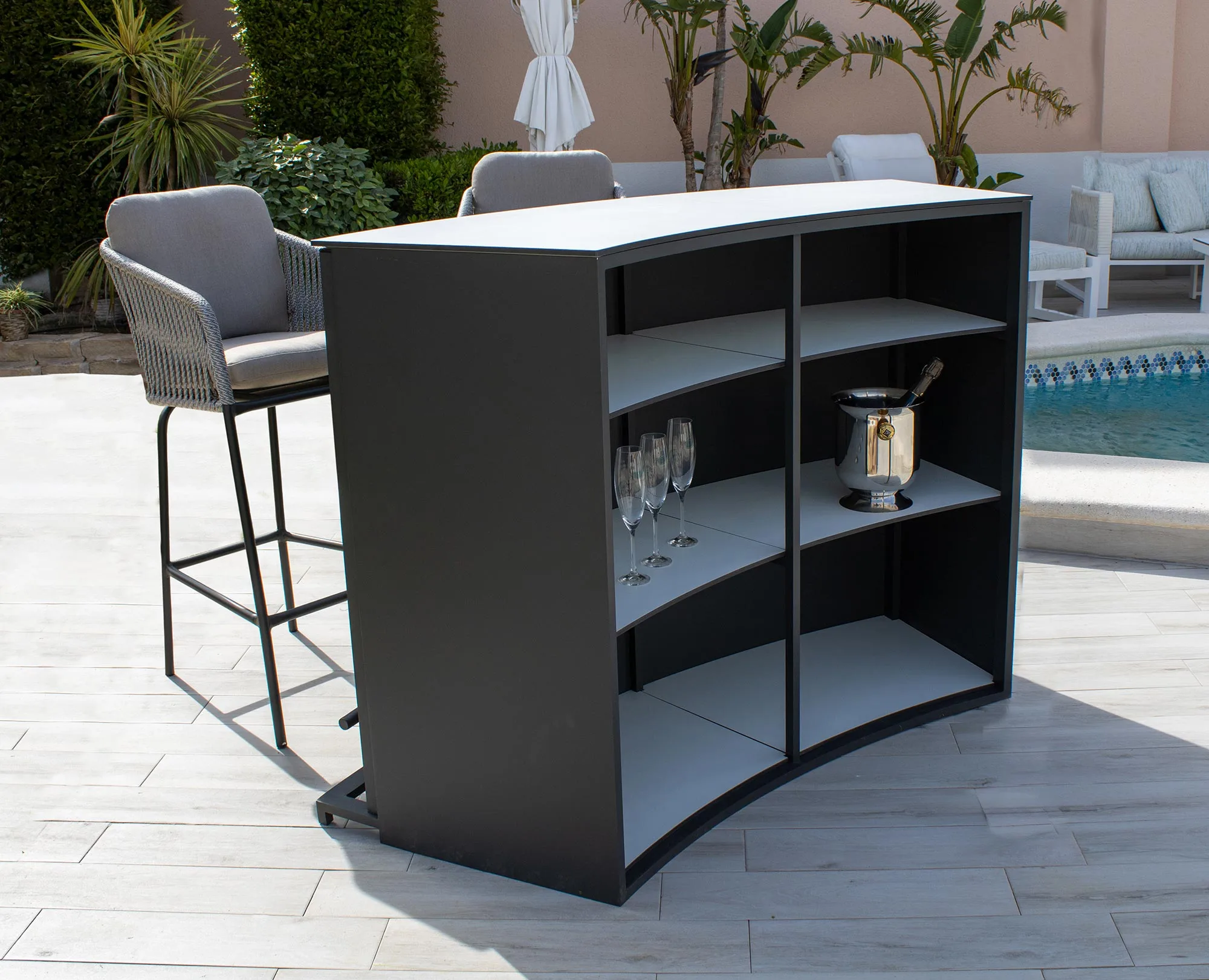Esta barra de bar no solo es bonita, sino también práctica. Cuenta con un almacenamiento integrado que te permite guardar botellas, copas o utensilios de cocina, manteniendo todo organizado y al alcance de tu mano. El reposapiés incorporado añade un toque de comodidad, ideal para disfrutar de momentos relajados con familiares y amigos. Su diseño ergonómico y funcional la convierte en una opción perfecta para quienes buscan muebles de exterior modernos que optimicen el espacio sin sacrificar el estilo.*Taburetes de aluminio apilables Maribor no incluidos en el precio.