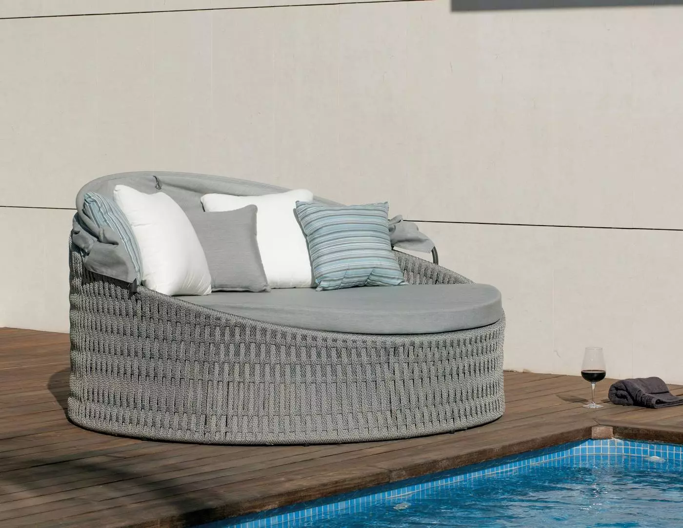 Elegante y funcional cama redonda de jardín fabricada en aluminio y cuerda trenzada, ideal para tus momentos de relax y descanso al aire libre frente al mar o alrededor de la piscina en compañía de tus familiares o amigos.