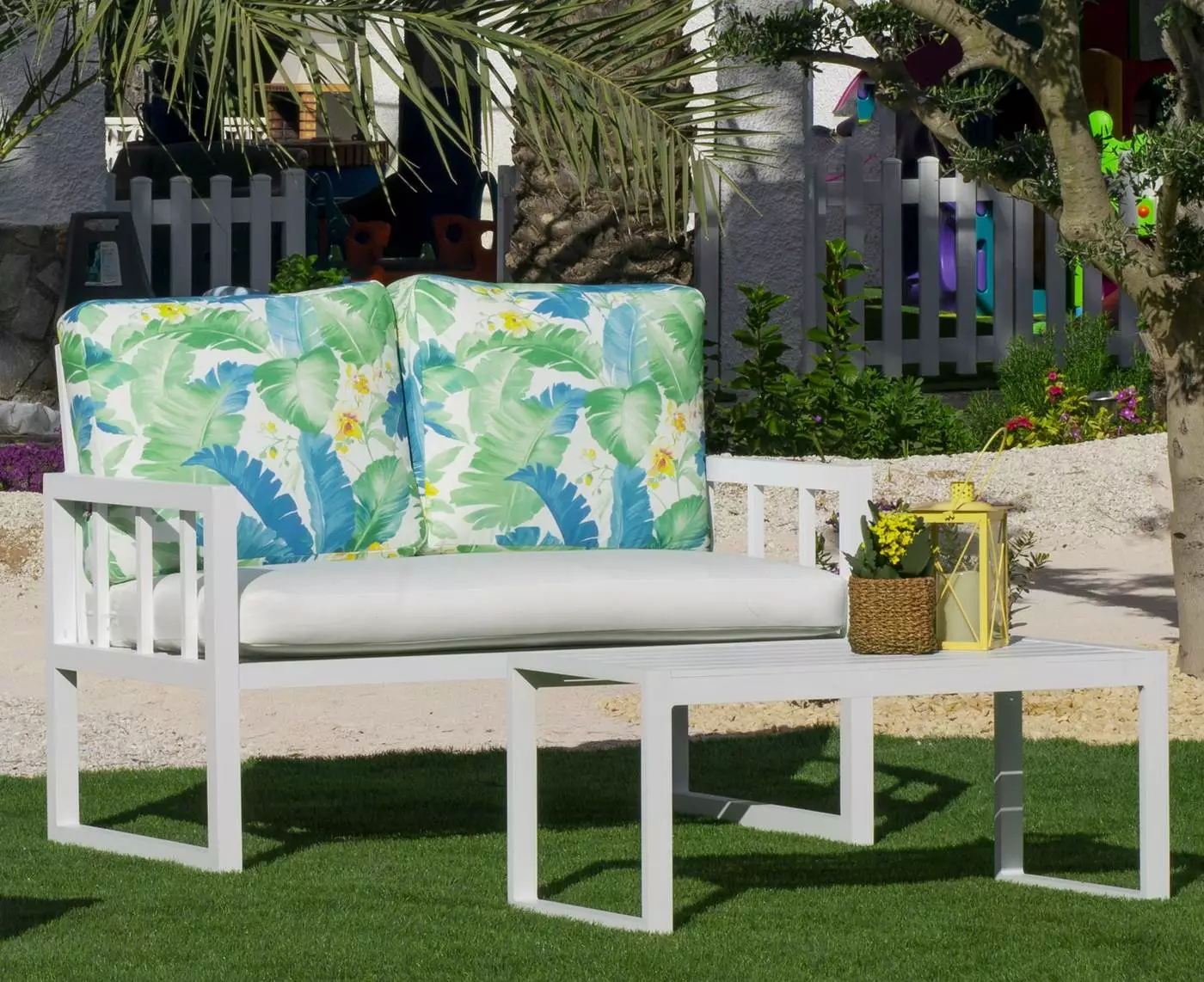 Conjunto de jardín fabricado en aluminio compuesto por 1 cómodo sofá de dos plazas, 2 elegantes sillones con sus respectivos reposapiés y una cómoda mesa a juego. De elegante diseño y con una robusta estructura diseñada para proporcionar comodidad, es la mejor opción para relajarse, leer un libro o descansar. Su limpio y original diseño, otorgan a este conjunto de exterior modernidad y elegancia. Especialmente diseñado para soportar las condiciones adversas como el sol y la lluvia, así como los rigores del uso diario. Fabricamos la estructura en tres colores distintos; champagne, blanco y gris antracita.En la fabricación de este set de exterior, se han utilizado las mejores materias primas que la hacen muy resistente y duradera. Estructura y uniones fabricadas en aluminio extrusado de alta calidad y no reciclado. Los tubos de aluminio que la forman están perfectamente lijados para eliminar cualquier imperfección o irregularidad en las juntas. Así mismo, dichos tubos están especialmente pulidos para abrir los poros del aluminio y facilitar la fijación de la pintura. Las patas llevan tacos para evitar rallar el suelo y reducir el ruido producido con el movimiento.La tapicería está fabricada con cojines desenfundables con tejido Dralón Luxentre sus principales características destacamos: