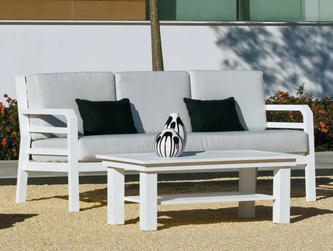 Conjunto de sofá y sillones para exterior fabricado en aluminio compuesto por 1 cómodo sofá de tres plazas, 2 elegantes sillones y una cómoda mesa a juego. Un conjunto elegante para que disfrutes de momentos al sol y en buena compañía, ya sea con la familia o con amigos, o dar a tus usuarios la comodidad que se merecen.