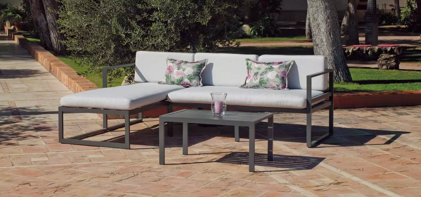 Su limpio y original diseño, otorgan a este conjunto de exterior modernidad y elegancia. Especialmente diseñado para soportar las condiciones adversas como el sol y la lluvia, así como los rigores del uso diario. Fabricamos la estructura en seis colores distintos; champagne, negro, marrón, plata, blanco y gris antracita.En la fabricación de este sofá chaise longue para terraza, se han utilizado las mejores materias primas que la hacen muy resistente y duradera. Estructura y uniones fabricadas en aluminio extrusado de alta calidad y no reciclado. Los tubos de aluminio que la forman están perfectamente lijados para eliminar cualquier imperfección o irregularidad en las juntas. Así mismo, dichos tubos están especialmente pulidos para abrir los poros del aluminio y facilitar la fijación de la pintura. Las patas llevan tacos para evitar rallar el suelo y reducir el ruido producido con el movimiento.La tapicería está fabricada con cojines desenfundables con tejido Dralón Luxentre sus principales características destacamos: