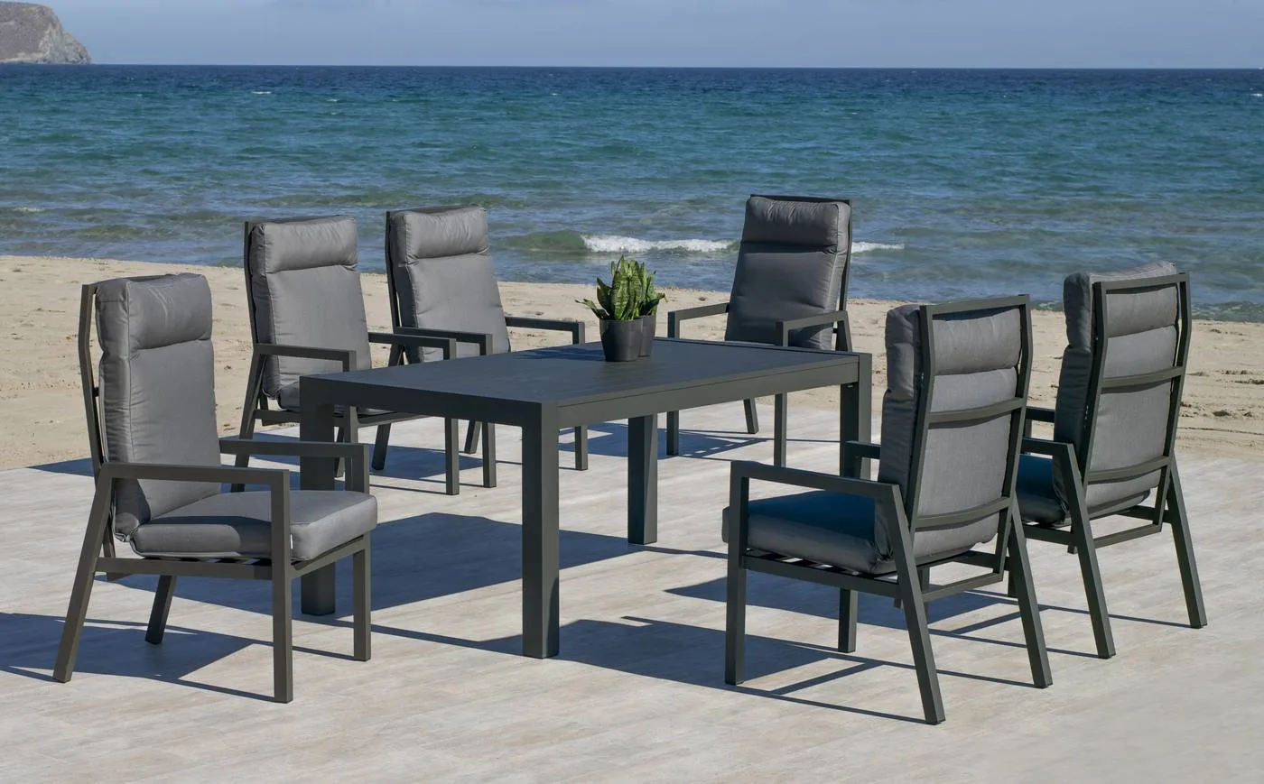 Os presentamos este espectacular conjunto de comedor para exterior compuesto por una mesa rectangular de 180 ó 220 de ancho y 6 sillones de gran confort, fabricado con una robusta estructura de aluminio que facilita su movilidad y podrá ubicarse en cualquier espacio de su jardín gracias a su poco peso. Un conjunto elegante para que disfrutes de momentos al sol y en buena compañía, ya sea con la familia o amigos.