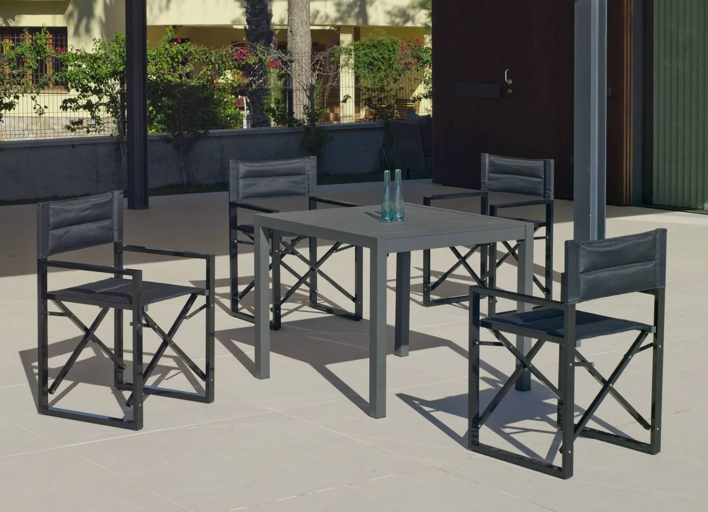 Este conjunto de comedor para jardín fabricado en aluminio que te presentamos es una verdadera joya que añadirá un toque de elegancia y comodidad a cualquier espacio al aire libre. Este conjunto se compone de una mesa cuadrada y cuatro sillas de Director, diseñadas para brindar una experiencia de lujo en tu jardín, patio o terraza.