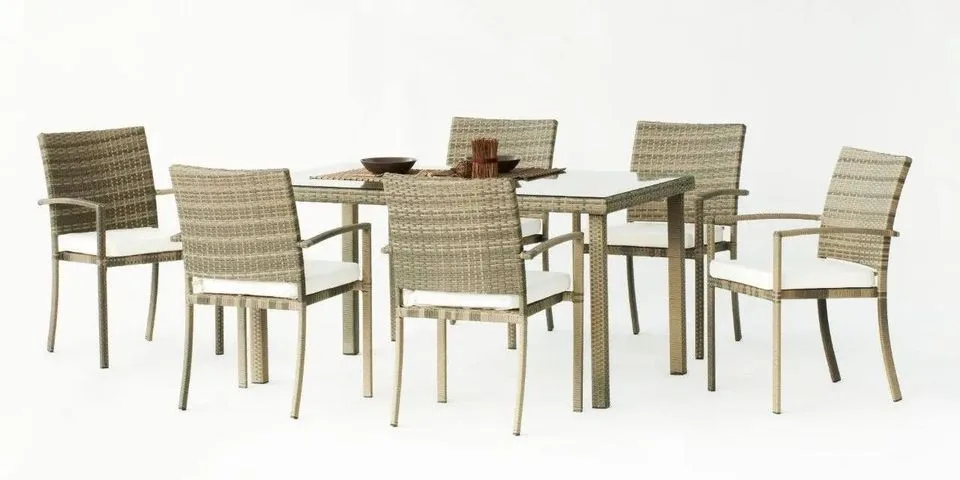 Precioso conjunto de comedor  para terraza o jardín compuesto por una mesa de ratán sintético y 6 sillas en color neutro.Gracias a su diseño, nuestro conjunto Venecia  encaja en todo tipo de jardines o terrazas. ¡Disfrutar de preciosos atardeceres está a la vuelta de la esquina! ¿A qué esperas para conseguir el tuyo? ¡No pierdas esta fantástica oportunidad! Venecia es un conjunto simple, elegante y sofisticado perfecto para darle a tu terraza el toque que necesita. ¡Aprovecha esta fantástica oferta! ÚLTIMA UNIDAD DISPONIBLE.