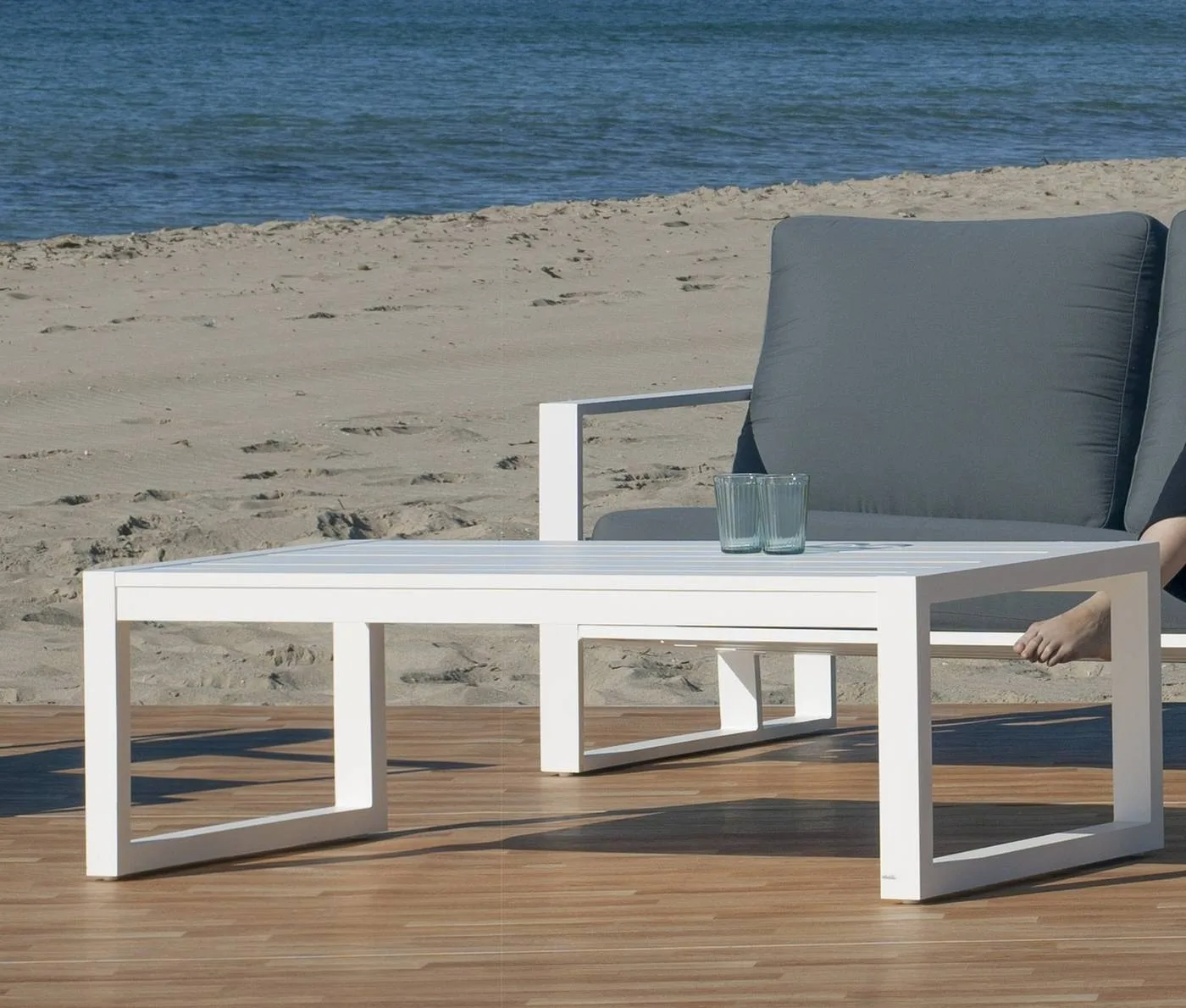 Conjunto de porche fabricado en aluminio compuesto por 1 cómodo sofá de jardín de dos plazas, 2 elegantes sillones  y una cómoda mesa a juego de aluminio. Con un diseño sofisticado y una robusta estructura te brindará el confort que necesitas. ¡Personalízalo a tu gusto! Su limpio y original diseño, otorgan a este conjunto de porche para jardín tanto modernidad como elegancia. Especialmente diseñado para soportar las condiciones adversas como el sol y la lluvia, así como los rigores del uso diario. Fabricamos la estructura en ocho colores distintos; blanco, gris antracita, champán, marrón, nude, melocotón, negro y plata.En la fabricación de este mueble para porche de exterior, se han utilizado las mejores materias primas que la hacen muy resistente y duradera. Estructura y uniones fabricadas en aluminio extrusado de alta calidad y no reciclado. Los tubos de aluminio que la forman están perfectamente lijados para eliminar cualquier imperfección o irregularidad en las juntas. Así mismo, dichos tubos están especialmente pulidos para abrir los poros del aluminio y facilitar la fijación de la pintura. Las patas llevan tacos para evitar rallar el suelo y reducir el ruido producido con el movimiento.La tapicería está fabricada con cojines desenfundables con tejido Dralón Luxentre sus principales características destacamos: