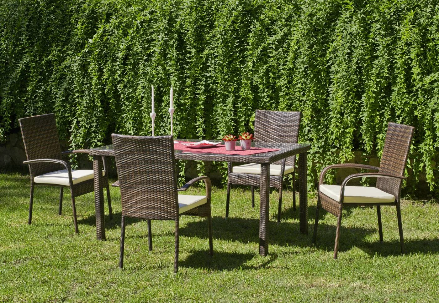 Precioso y práctico conjunto de exterior en ratán marrón compuesto por una mesa de comedor de 150 x 90 cm. con tapa de cristal templado y 4 cómodas sillas con brazos apilables. Una opción perfecta para cualquier tipo de terraza o jardín.