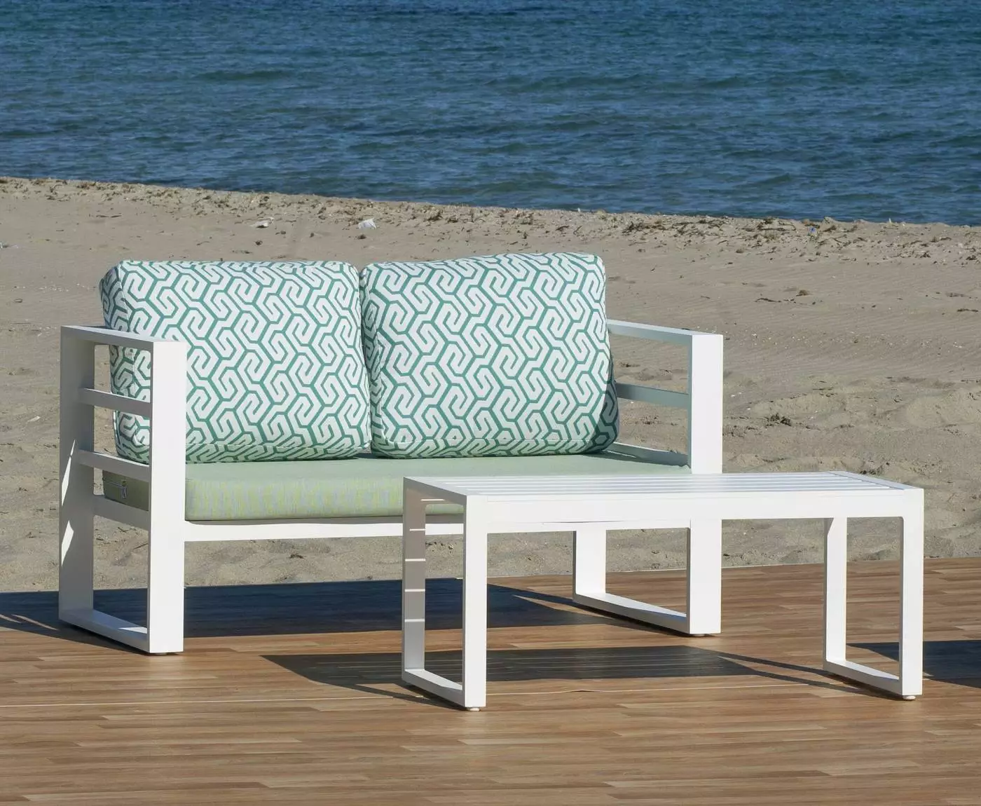 Conjunto para jardín de aluminio compuesto por 1 bonito sofá de dos plazas, 2 elegantes sillones con sus respectivos reposapiés y una cómoda una mesa a juego. Con un diseño sofisticado y una robusta estructura te brindará el confort que necesitas. ¡Personalízalo a tu gusto!
