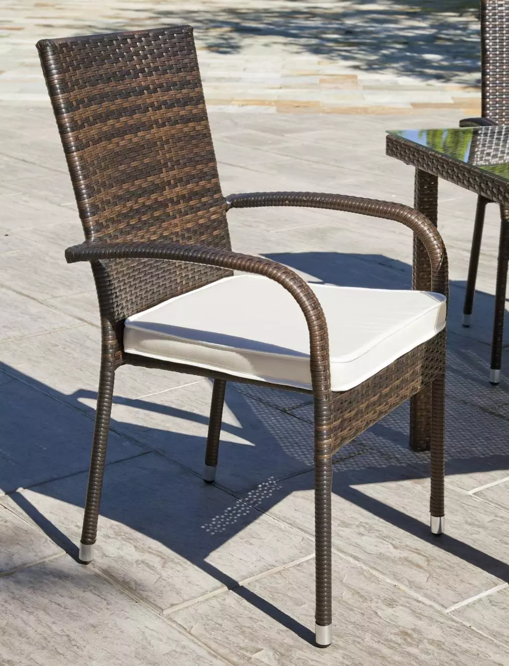 Precioso conjunto de jardín fabricado en ratán marrón compuesto por una mesa de centro de 90 cm. de diámetro con tapa de cristal templado y 4 cómodos sillones apilables.