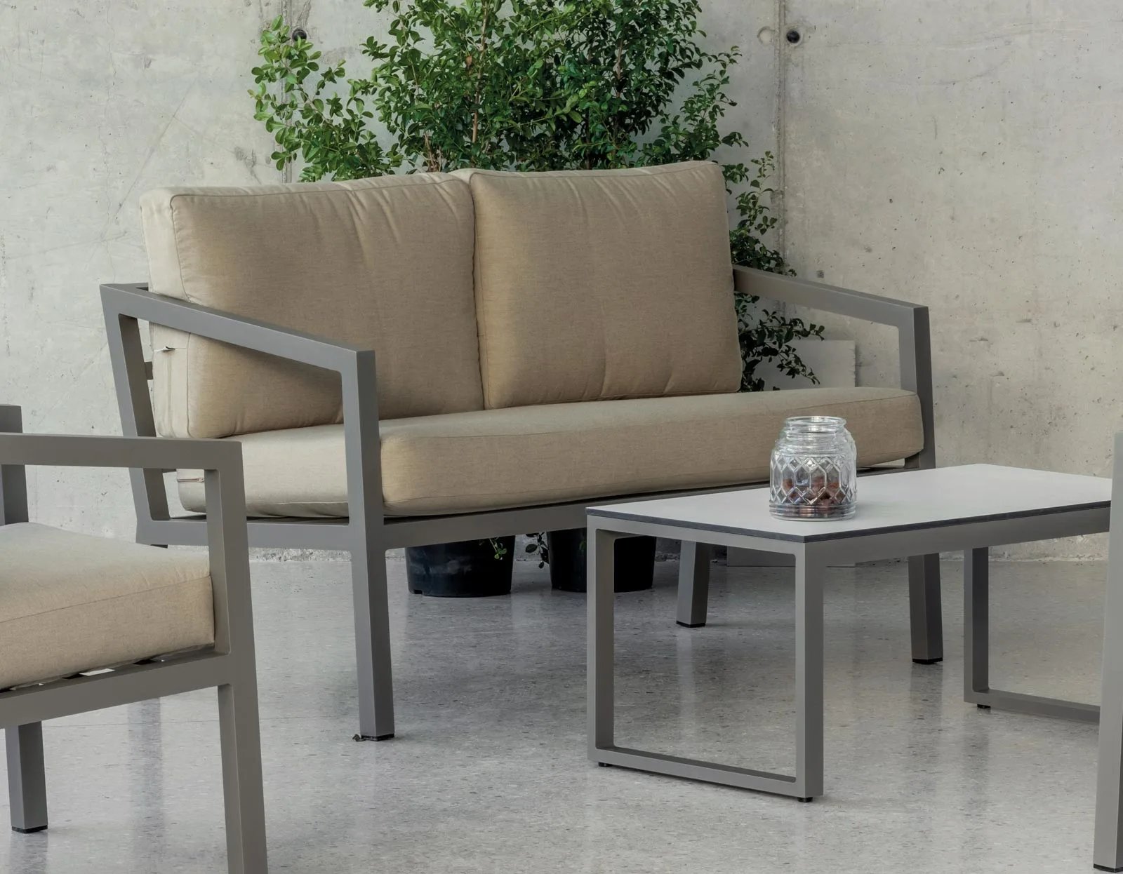 Este conjunto de jardín fabricado en aluminio es una elegante y funcional opción para realzar la belleza de tu espacio exterior. La mesa de comedor central es un punto focal que invita a compartir momentos agradables al aire libre. Su diseño cuidadosamente trabajado refleja un equilibrio entre lo moderno y lo funcional. Cuenta con una superficie espaciosa que brinda suficiente espacio para acomodar comidas y bebidas, creando así un ambiente perfecto para reuniones y cenas al aire libre.El sofá de dos plazas y los dos sillones complementan el conjunto, ofreciendo asientos cómodos y relajantes. Los suaves cojines, de tejido Dralón, proporcionan un acolchado confortable, permitiéndote disfrutar de largas charlas y momentos de tranquilidad en tu jardín. La ergonomía de los sillones y el sofá aseguran una postura adecuada para una relajación sin igual.Una de las ventajas más notables de este conjunto es el uso del aluminio como material principal. Este metal no solo añade un toque de modernidad, sino que también es altamente resistente a la intemperie, lo que garantiza su durabilidad a lo largo del tiempo. Además, la ligereza del aluminio facilita la reubicación de las piezas según tus preferencias.