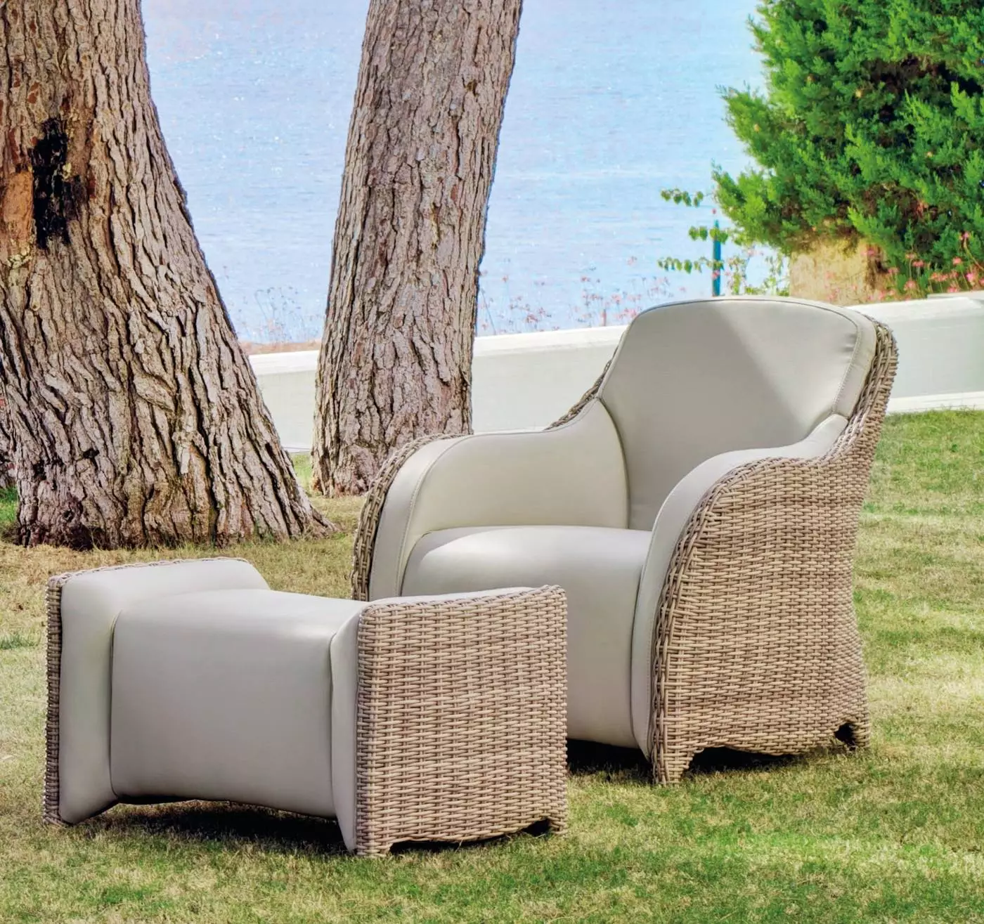 Elegante conjunto de jardín gran lujo fabricado en ratán con asientos de polipiel de alta calidad y estructura de aluminio compuesto por un sofá de 3 plazas, dos sillones con reposapiés y una mesa de centro. Una opción perfecta para cualquier tipo de jardín y que te ofrecerá un ambiente agradable y relajante para disfrutar al aire libre.