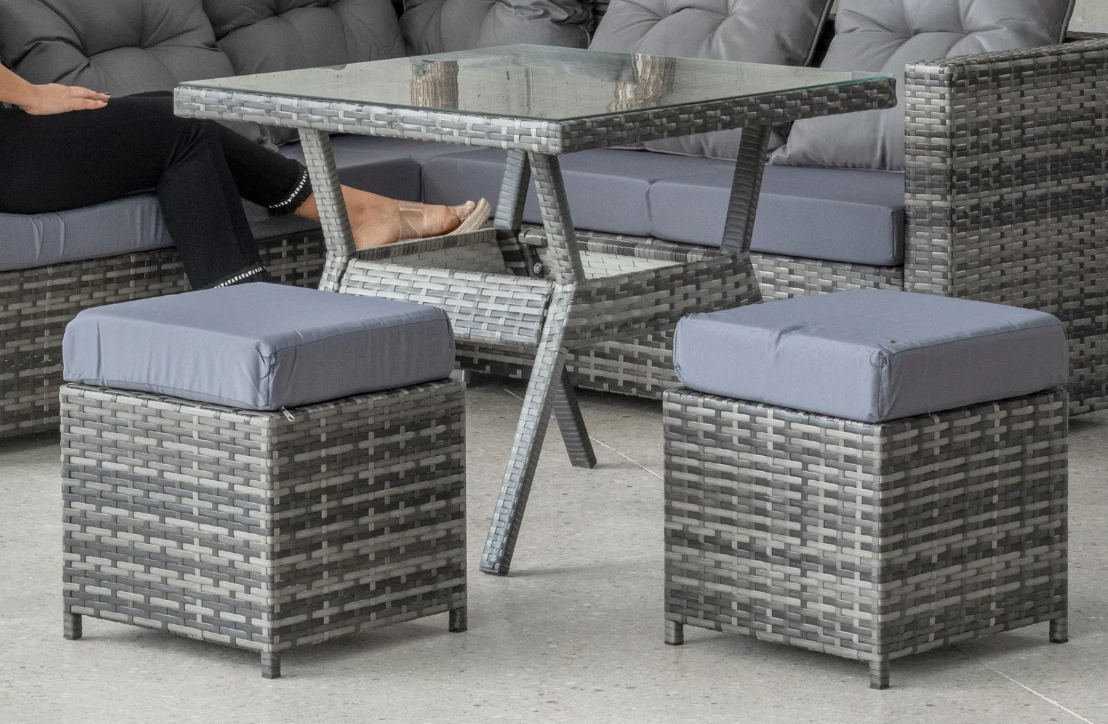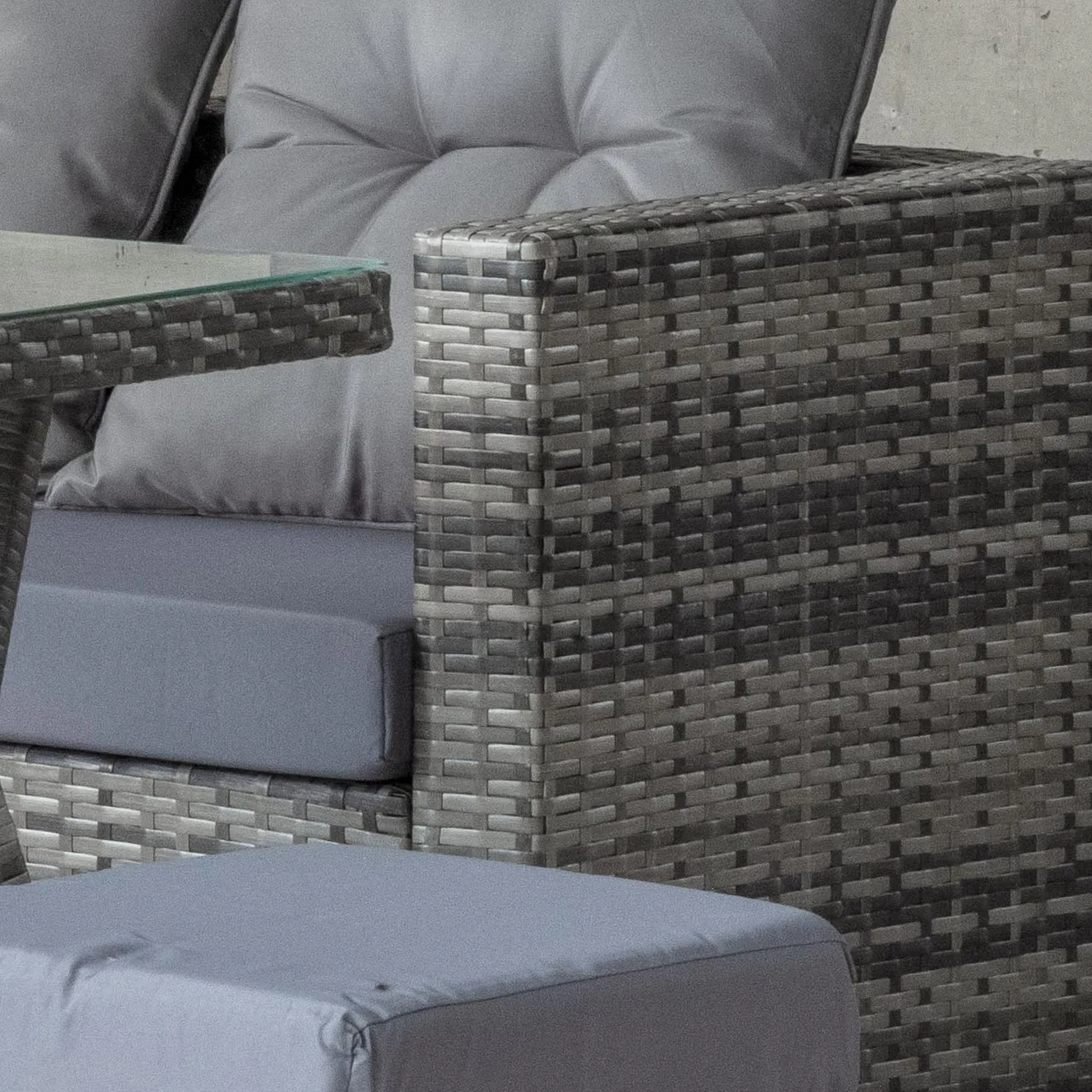 Con este conjunto de sofá rinconera, podrás disfrutar de tus tardes de verano leyendo un libro o simplemente relajándote en tu jardín. Gracias a sus suaves y mullidos cojines y su amplio espacio para sentarse, podrás compartir momentos especiales con tu familia y amigos mientras disfrutan de la fresca brisa de verano.El diseño de este conjunto de sofá rinconera es elegante y moderno gracias a su color gris, que se adapta fácilmente a cualquier estilo de decoración exterior. Además, el material de ratán sintético con el que está fabricado es de alta calidad y muy fácil de mantener y limpiar, lo que significa que podrás disfrutar de tu sofá rinconera por muchos años.Este conjunto está compuesto por los siguientes elementos: