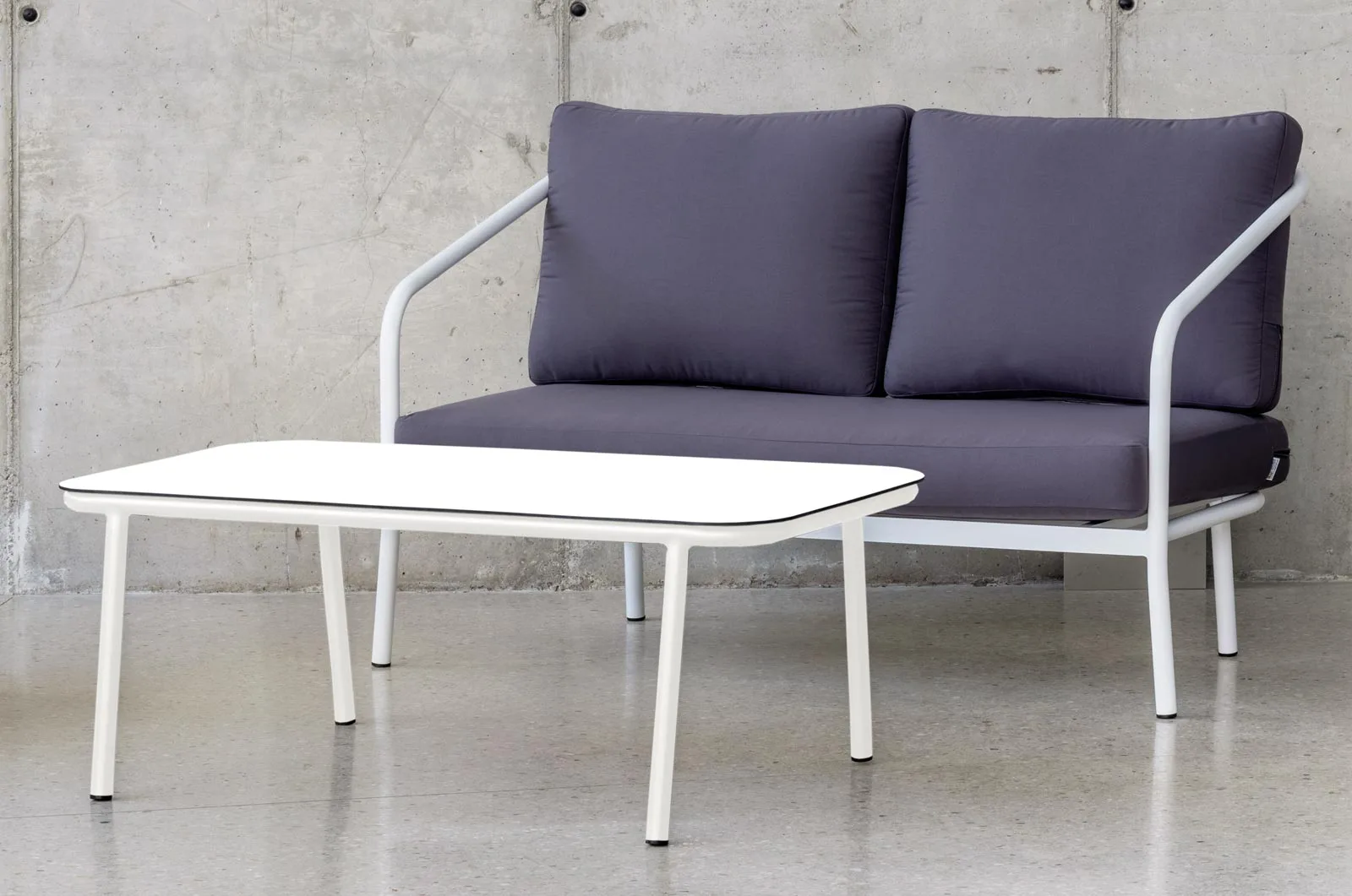 Elegante y minimalista conjunto de sofá y sillones para exterior fabricado en aluminio compuesto por 1 cómodo sofá de dos plazas, 2 elegantes sillones y una cómoda mesa baja a juego con tablero de HPL. Un conjunto elegante, diseñado para ofrecer una experiencia de relajación y comodidad en espacios al aire libre, para que disfrutes de momentos al sol y en buena compañía, ya sea con la familia o con amigos.