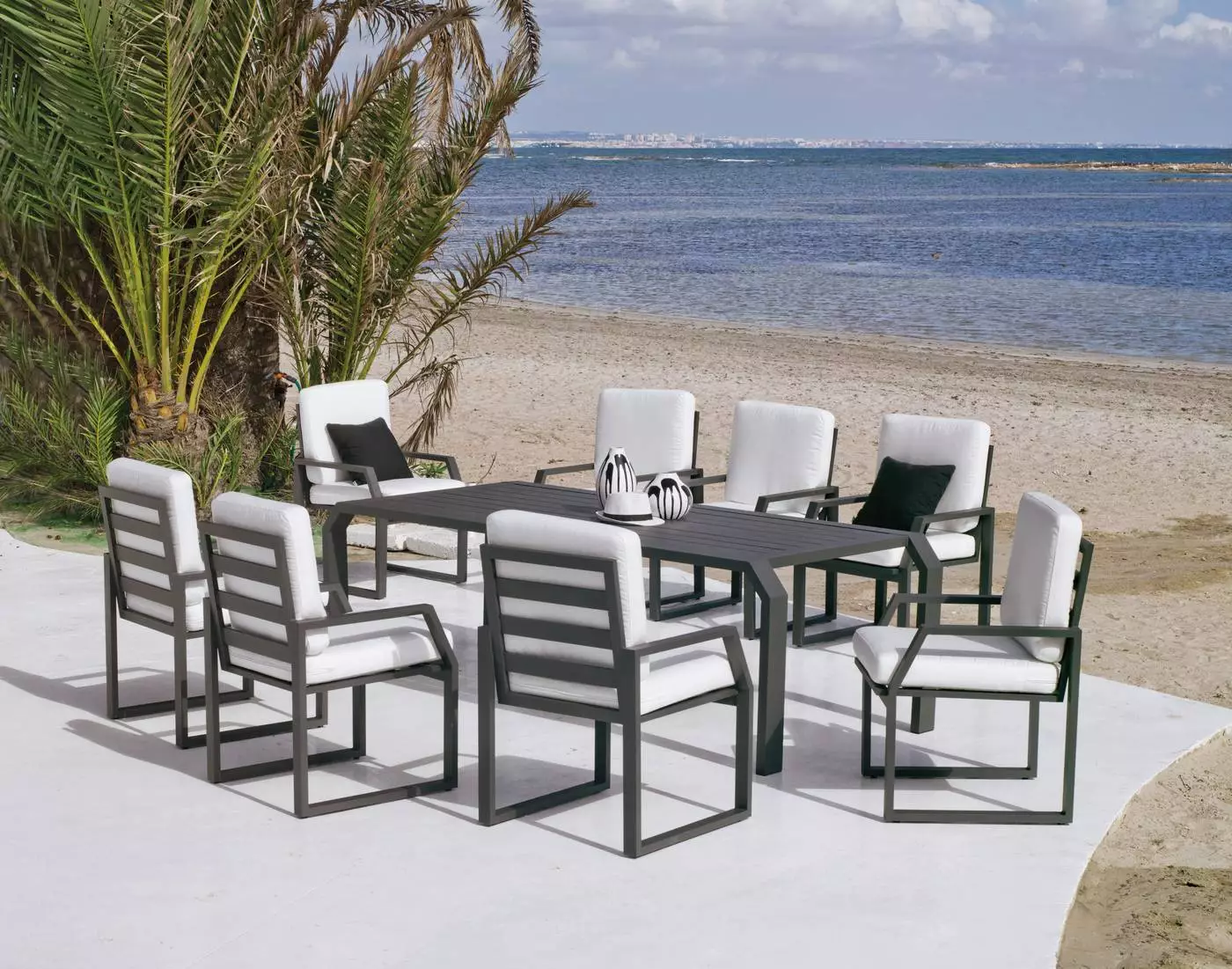 Set de comedor para exterior, compuesto por una robusta mesa rectangular y 8 sillones de gran confort con cojines con tapicería Dralón desenfundables.