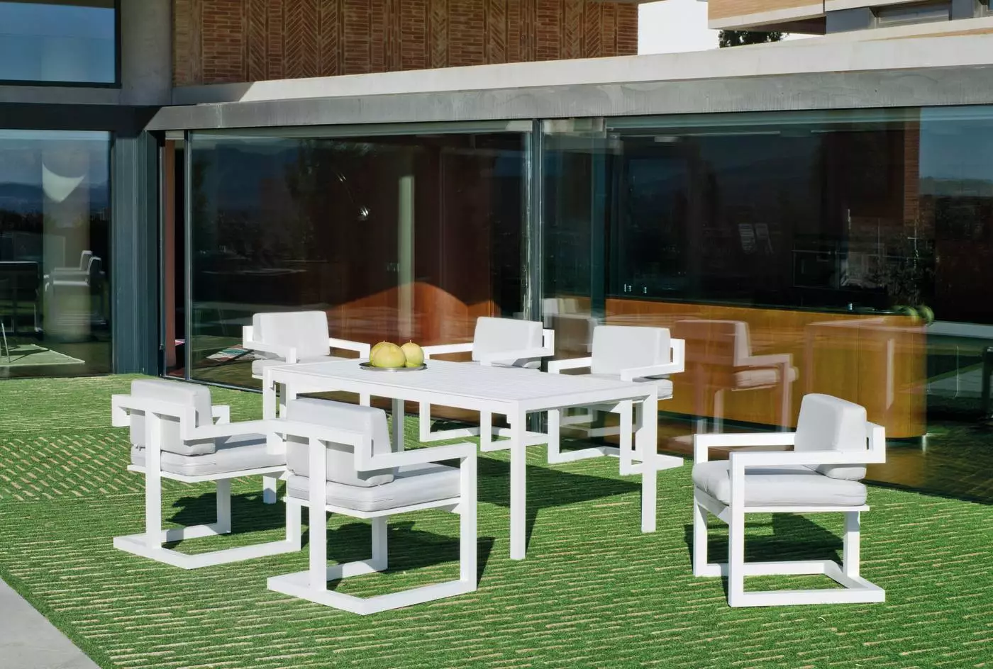 Conjunto de comedor para exterior fabricado con una robusta estructura de aluminio que facilita su movilidad y podrá ubicarse en cualquier espacio de su jardín gracias a su poco peso. Es una excelente opción para aquellos que buscan una combinación de estilo y funcionalidad en su comedor. Los sillones de aluminio, con cojines con tapicería Dralón desenfundables, le dan un aspecto moderno y elegante, mientras que la mesa rectangular es perfecta para reuniones familiares y cenas con amigos.