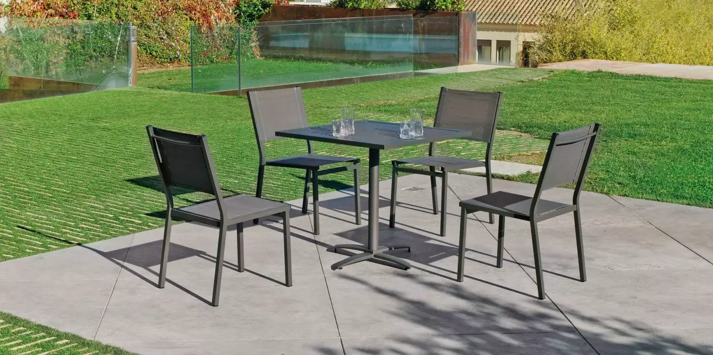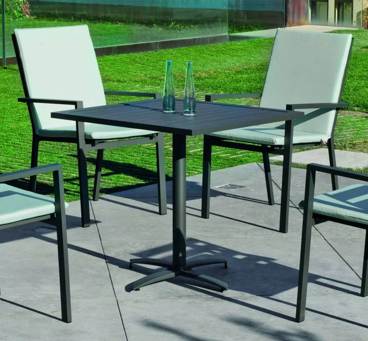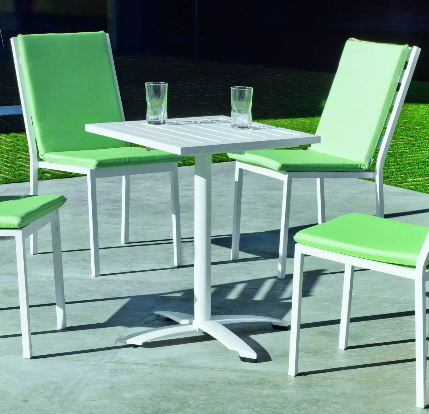 Moderna y original mesa de bar cuadrada con estructura de aluminio con acabados en colores blanco, plata, champagne o gris antracita y tablero laminado en HPL ultra resistente. La fabricamos en tres tamaños distintos; 60×60, 70×70 y 80×80 cm.