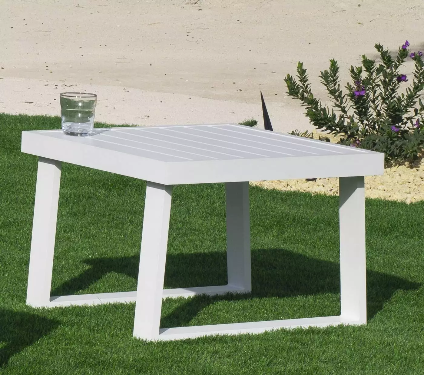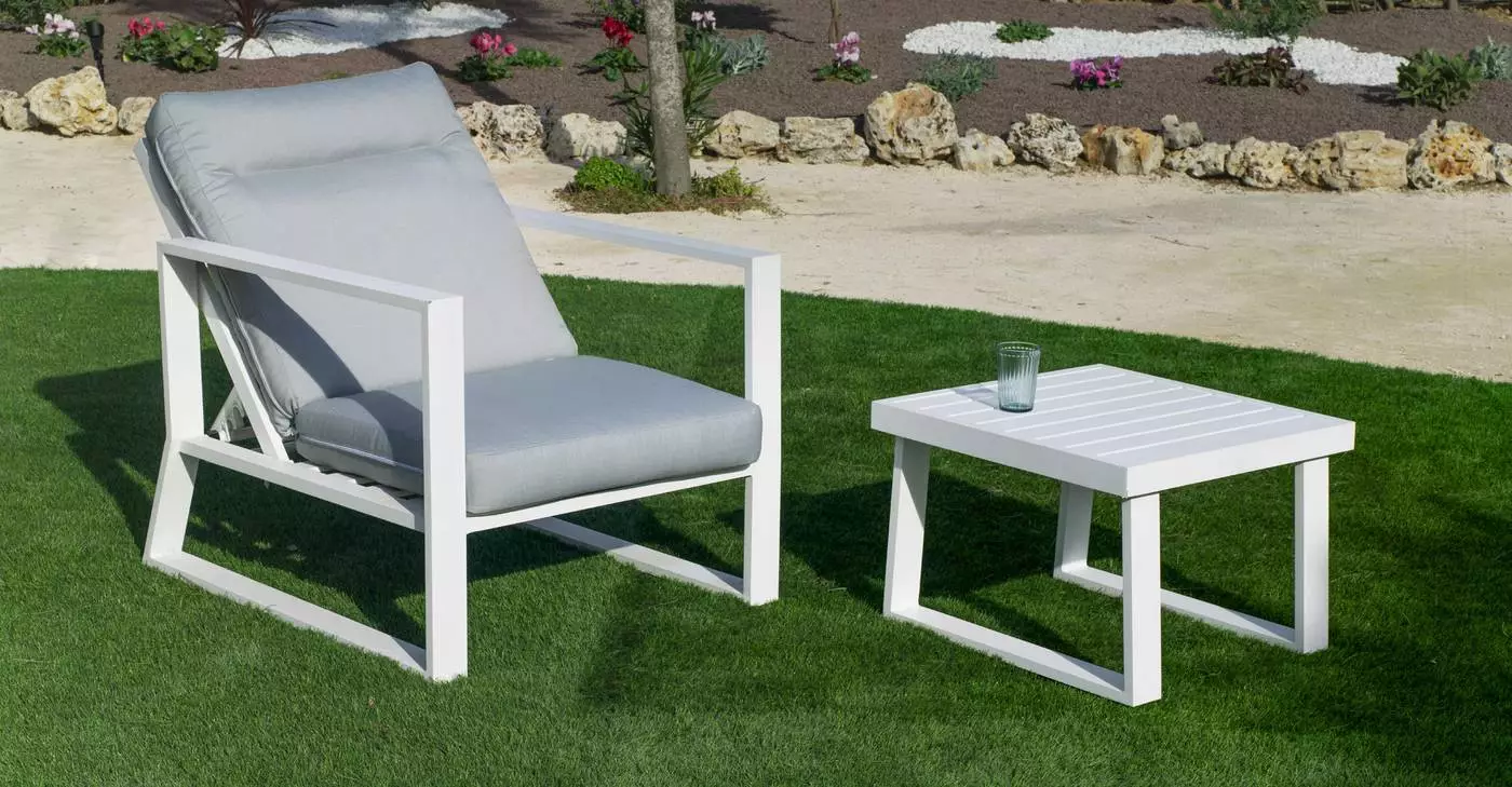 Mesa auxiliar jardín con estructura de aluminio, con acabados en color blanco o gris antracita y tres tamaños distintos; 60×60, 125×65 y 140×83 cm.