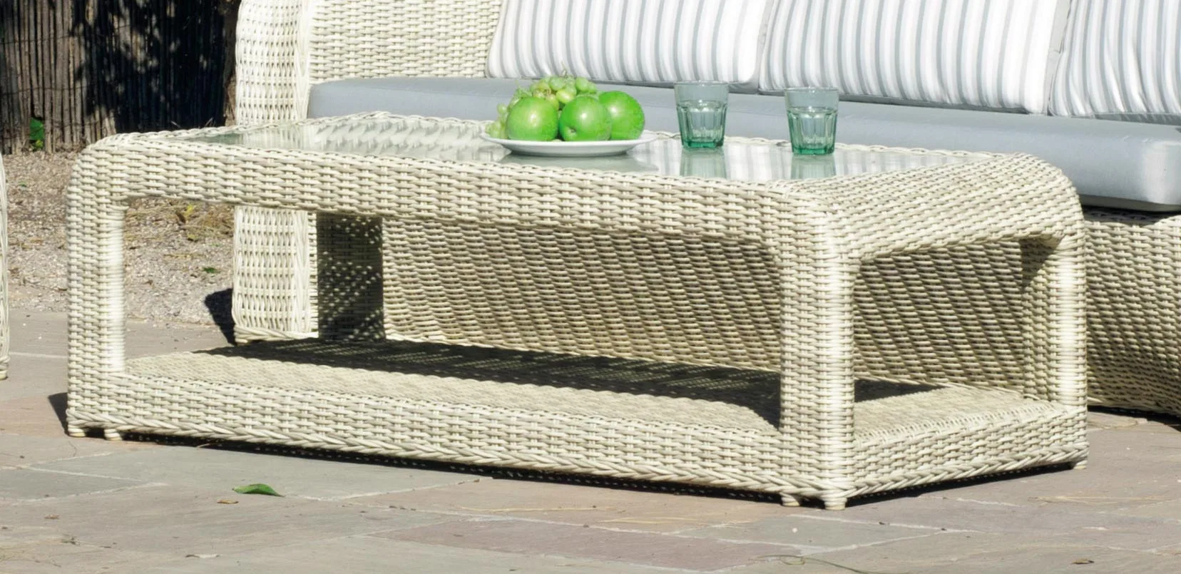 Os presentamos esta elegante mesa auxiliar rectangular de ratán modelo Celebes con la que añadirás a la decoración de tu jardín o terraza un toque clásico y distinto que no pasará desapercibido. Fabricada para todo aquel que busque calidad, una esmerada elaboración y un especial cuidado en todos los detalles.En la fabricación de esta mesa se han utilizado las mejores materias primas que la hacen muy resistente y duradera. Con una estructura de acero con recubrimiento en polvo cubierto con ratán sintético de calidad extra trenzado a mano de color marfil, se caracteriza por su resistencia y robustez y su fácil limpieza. Incluye tapa de cristal templado de seguridad de 5 mm. transparente, que se mantiene fijo gracias a cuatro ventosas.Como valor añadido, esta mesa de ratán, cuenta con un práctico estante de almacenamiento debajo de la mesa, ideal para revistas, libros o similares.Medidas