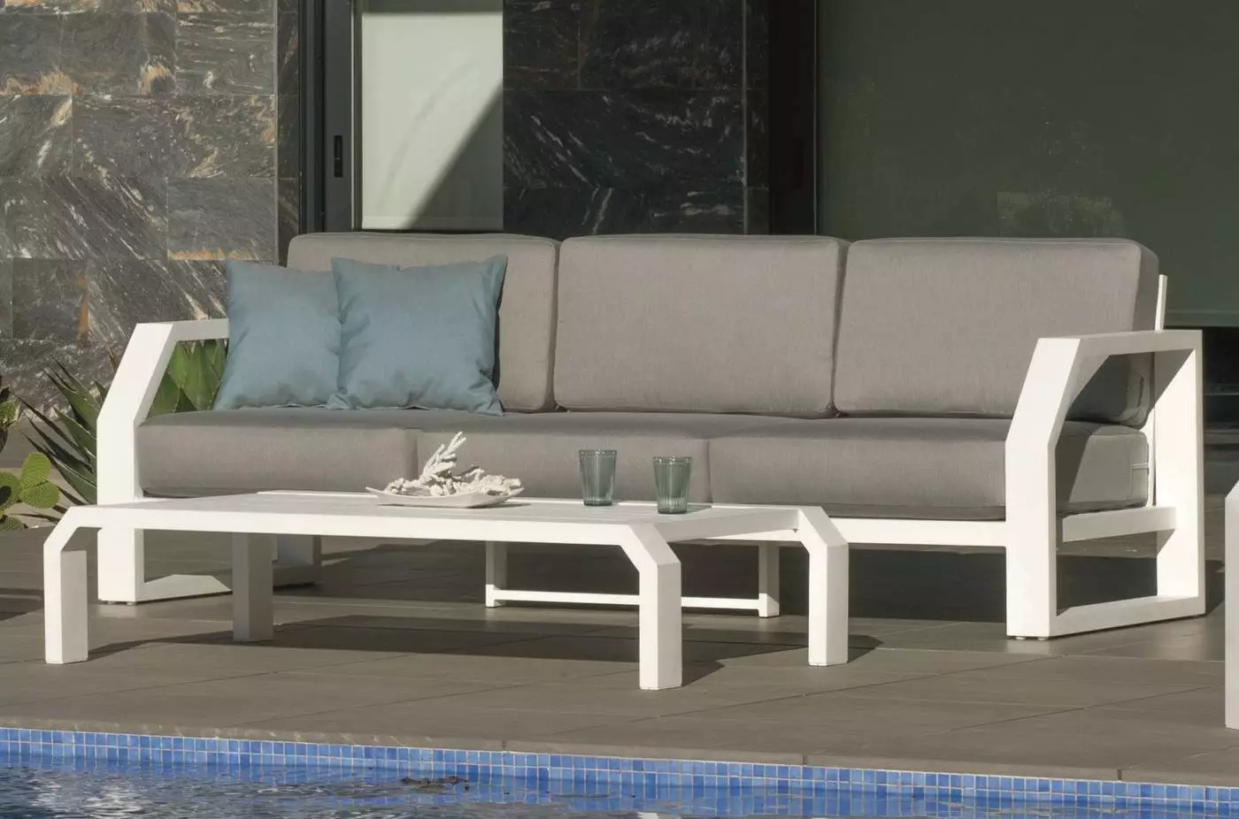 Mesa baja de centro rectangular para exterior en aluminio Zafiro con estructura de aluminio reforzada y ligera, con acabados en color blanco o gris antracita.Fabricada en una robusta estructura de aluminio que facilita su movilidad y que podrás ubicar en cualquier espacio de tu jardín gracias a su ligereza. Los tubos de aluminio que la forman están perfectamente lijados para eliminar cualquier imperfección o irregularidad en las juntas. Así mismo, dichos tubos están especialmente pulidos para abrir los poros del aluminio y facilitar la fijación de la pintura.El aluminio es el metal perfecto para la fabricación de muebles de exterior debido a sus propiedades antioxidantes, su ligereza y su gran durabilidad, así como por su gran resistencia a golpes y arañazos.Esta mesa de centro, de líneas rectas y depuradas, de aspecto moderno y vanguardista, podrás combinarla con cualquiera de nuestras sillas o sillones de exterior logrando crear un espacio único en tu jardín o terraza.Esta mesita auxiliar quedará ideal en tu jardín acompañada de nuestra tumbona de piscina con brazos Alba.Dimensiones