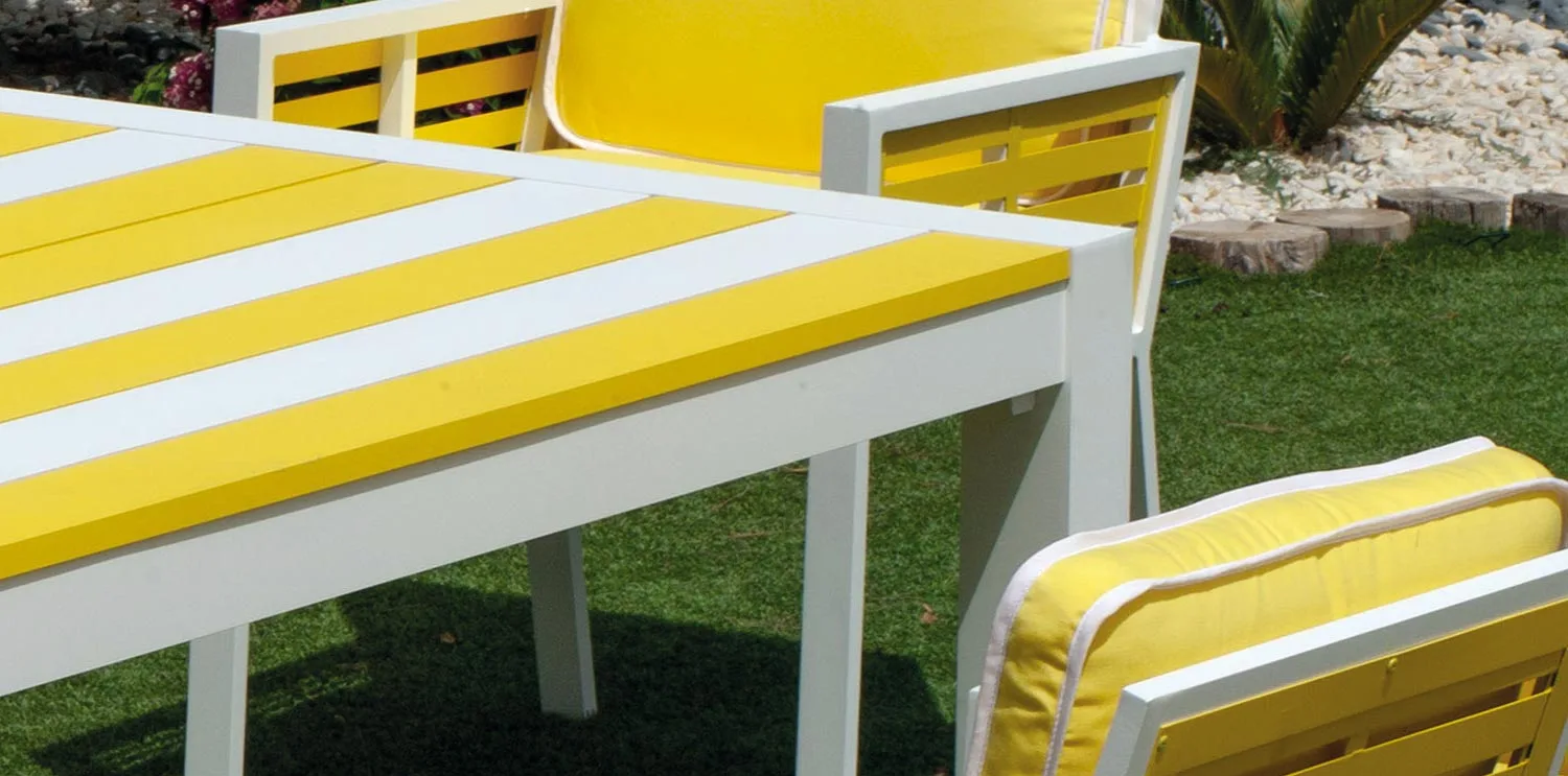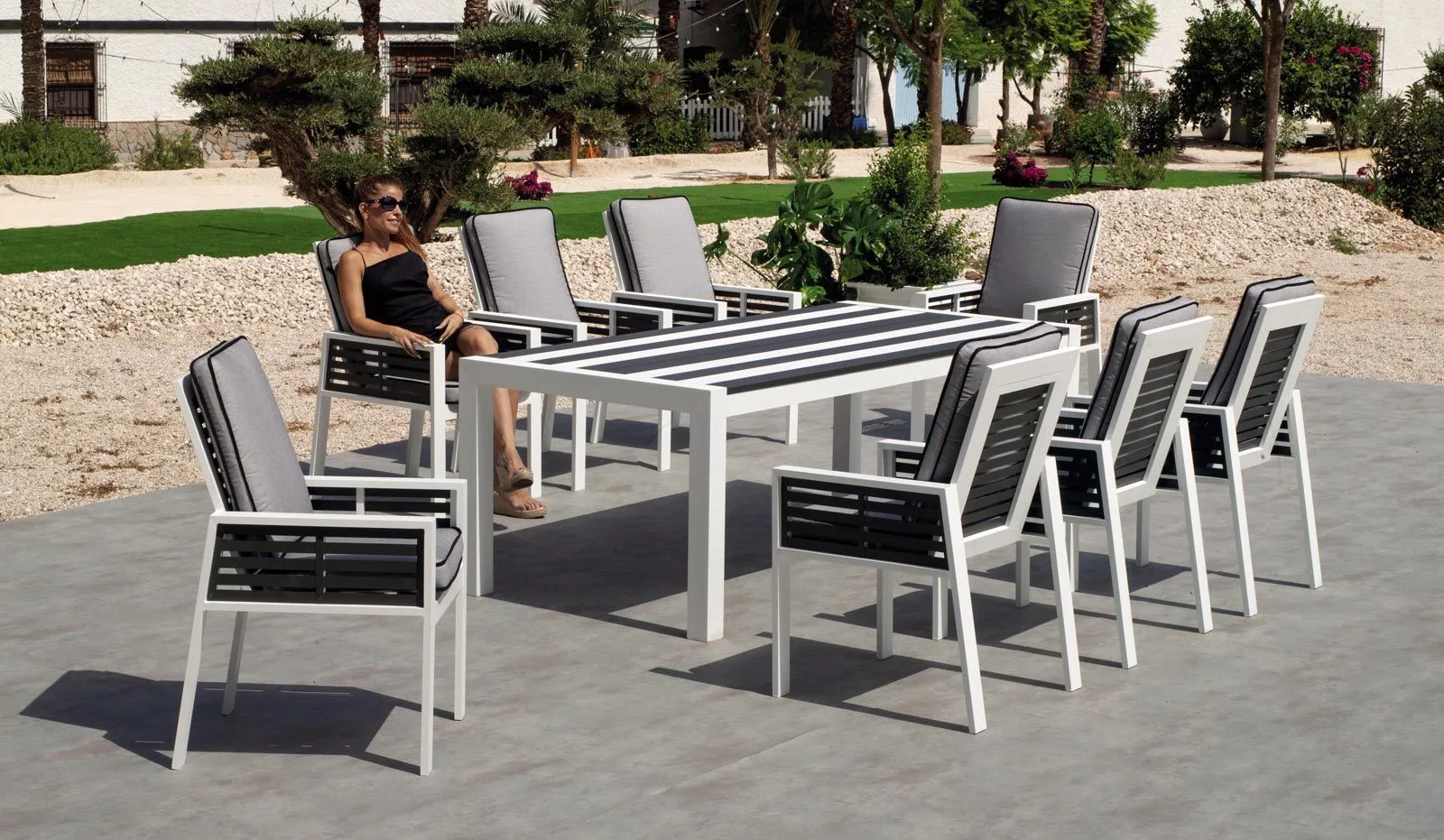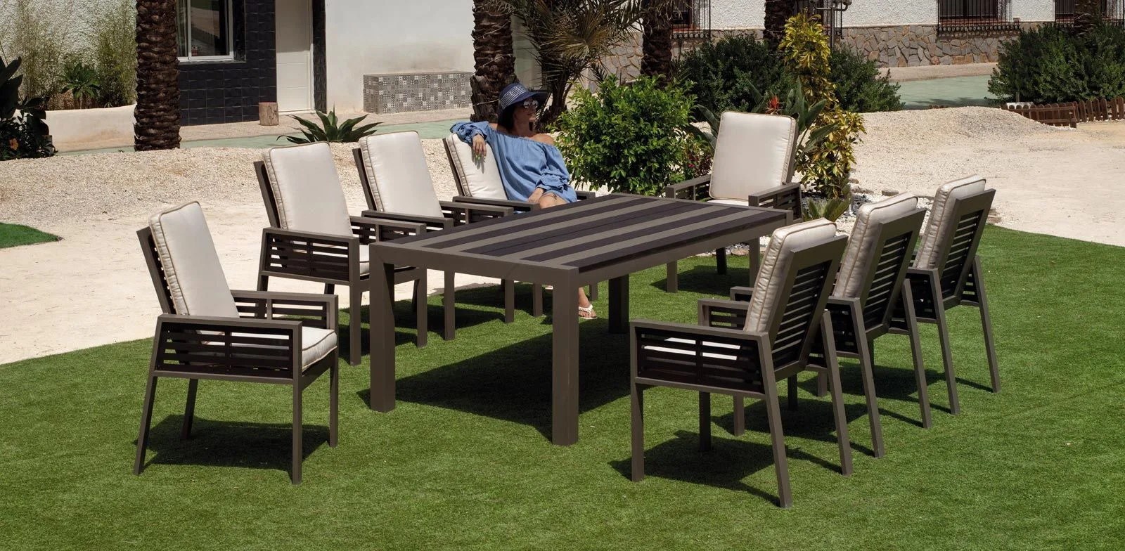 El jardín es un lugar donde la naturaleza y la creatividad se encuentran para dar vida a un espacio único. Si buscas un complemento perfecto para disfrutar de tus tardes al aire libre, esta mesa de comedor rectangular fabricada en aluminio bicolor es la elección perfecta. Fabricamos esta mesa en dos tamaños distintos; 180×105 y 240×105 cm. y en varios acabados; champagne/marrón, antracita/blanco, blanco/antracita, blanco/plata y blanco/amarillo..