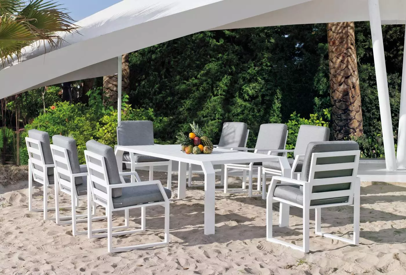 Esta elegante mesa de comedor para jardín y fabricada en aluminio, te ofrecerá un lugar relajado y cómodo en tu jardín para que puedas disfrutar del tiempo libre con tu familia y amigos.Su limpio y original diseño, otorgan a esta mesa de 240 para exterior modernidad y elegancia. Diseñada para soportar las condiciones adversas como el sol y la lluvia, así como los rigores del uso diario. La fabricamos en dos colores distintos; blanco y gris antracita.En la fabricación de esta mesa de comedor de 240 cm para terraza se han utilizado las mejores materias primas que la hacen muy resistente y duradera. Estructura y uniones fabricadas en aluminio extrusado de alta calidad y no reciclado. Los tubos de aluminio que la forman están perfectamente lijados para eliminar cualquier imperfección o irregularidad en las juntas. Así mismo, dichos tubos están especialmente pulidos para abrir los poros del aluminio y facilitar la fijación de la pintura. Las patas llevan tacos de goma  para evitar rallar el suelo y reducir el ruido producido con el movimiento. La tapa está formada con tablero lamas de aluminio.Esta mesa de comedor de 240 cm para exterior, pertenece al conjunto de jardín de 240 Zafiro.Medidas de la mesa de jardín de 240