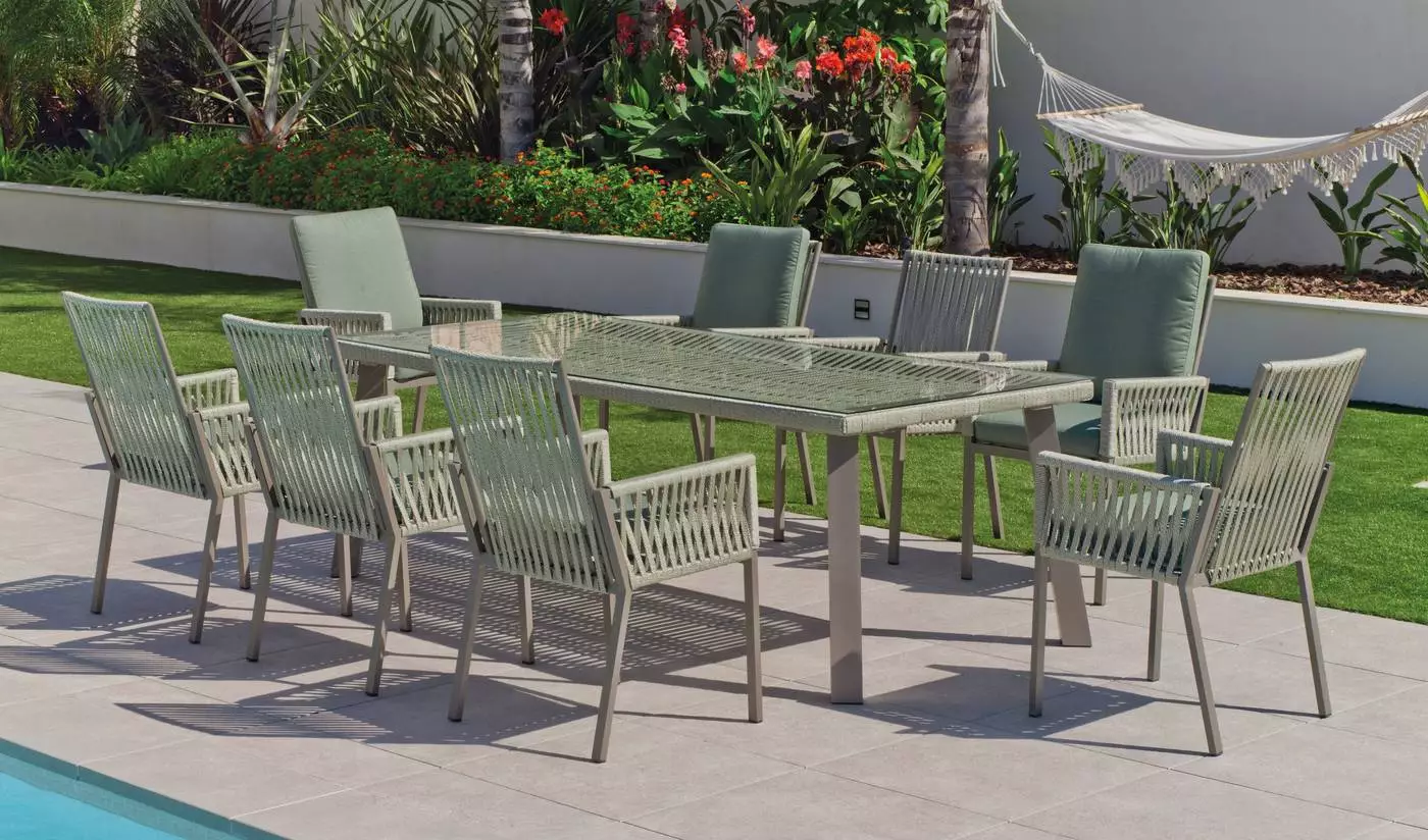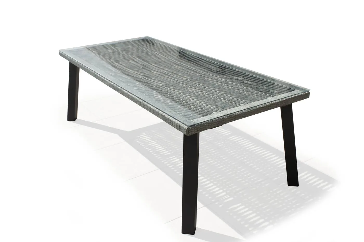 Descubre la combinación perfecta de estilo y funcionalidad con nuestra mesa de comedor rectangular para terraza. Fabricada con aluminio de alta calidad, cuerda trenzada y tapa de cristal templado, esta mesa es la elección ideal para disfrutar de momentos inolvidables al aire libre. Adecuada para cualquier estilo de decoración.