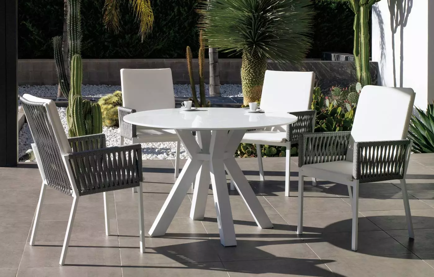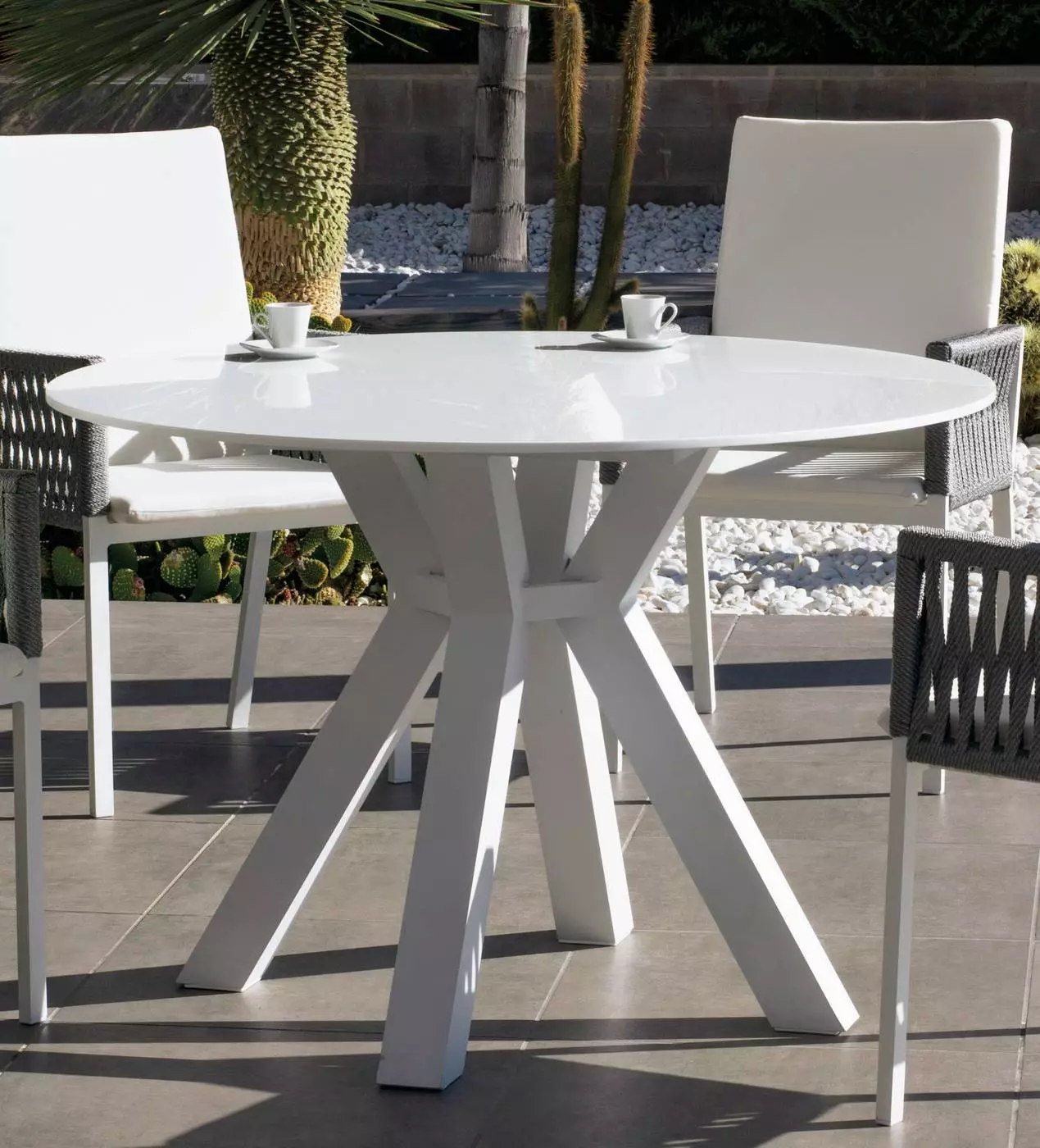 Original y práctica mesa redonda de comedor 150 cm. Fabricada en  aluminio y tablero de Krion modelo Montblanc con acabado en color blanco. La fabricamos en dos diámetros distintos; 120 y 150 cm.Fabricada en una robusta estructura de aluminio que facilita su movilidad y que podrás ubicar en cualquier espacio de tu jardín gracias a su ligereza. El aluminio es el metal perfecto para la fabricación de muebles de exterior debido a sus propiedades antioxidantes, su ligereza y su gran durabilidad, así como por su gran resistencia a golpes y arañazos.