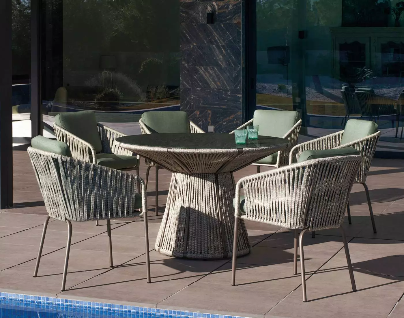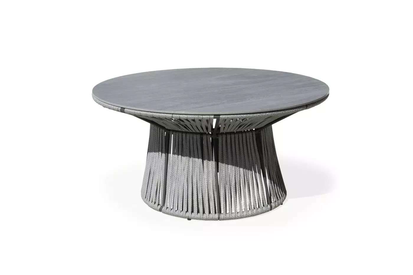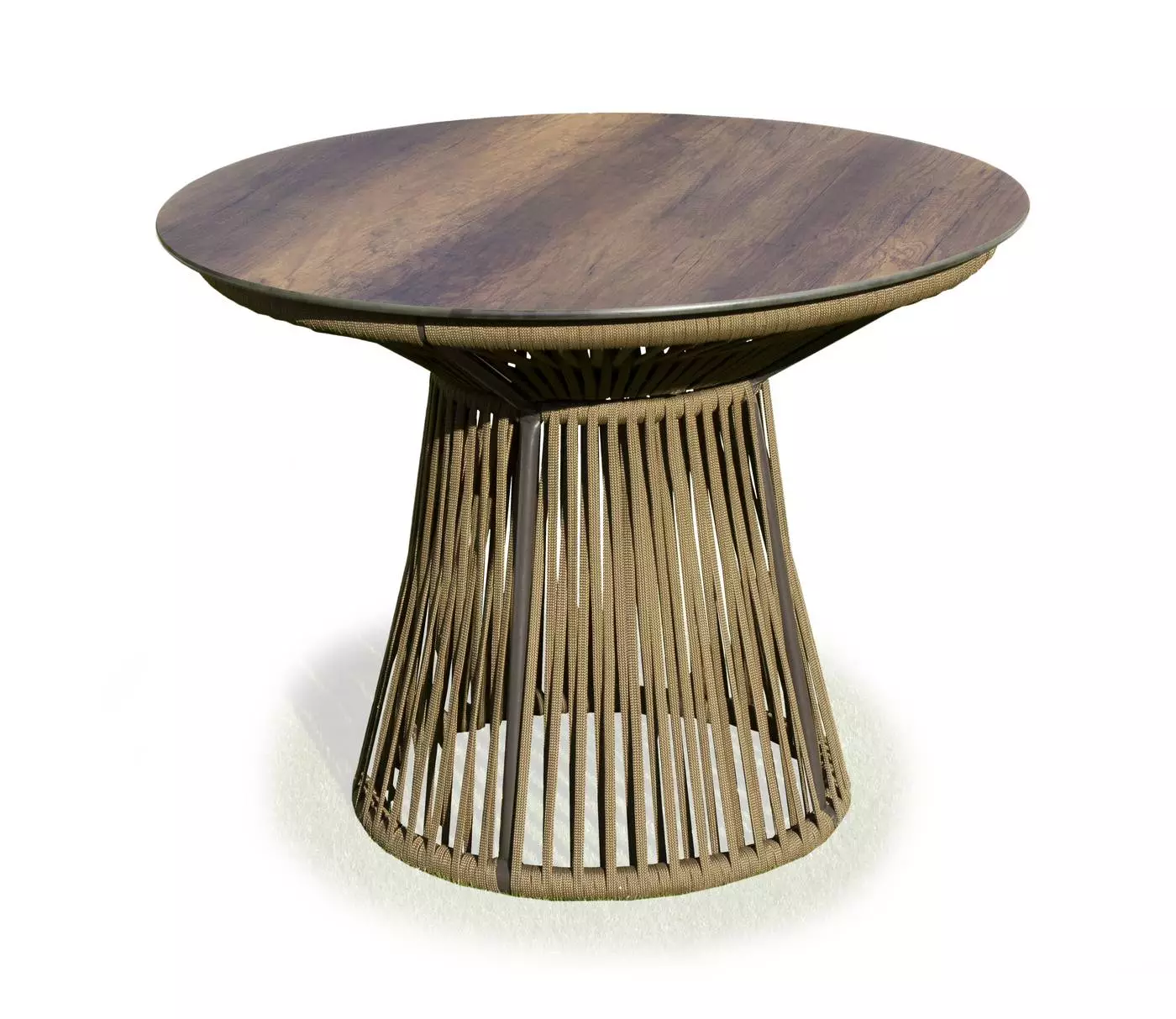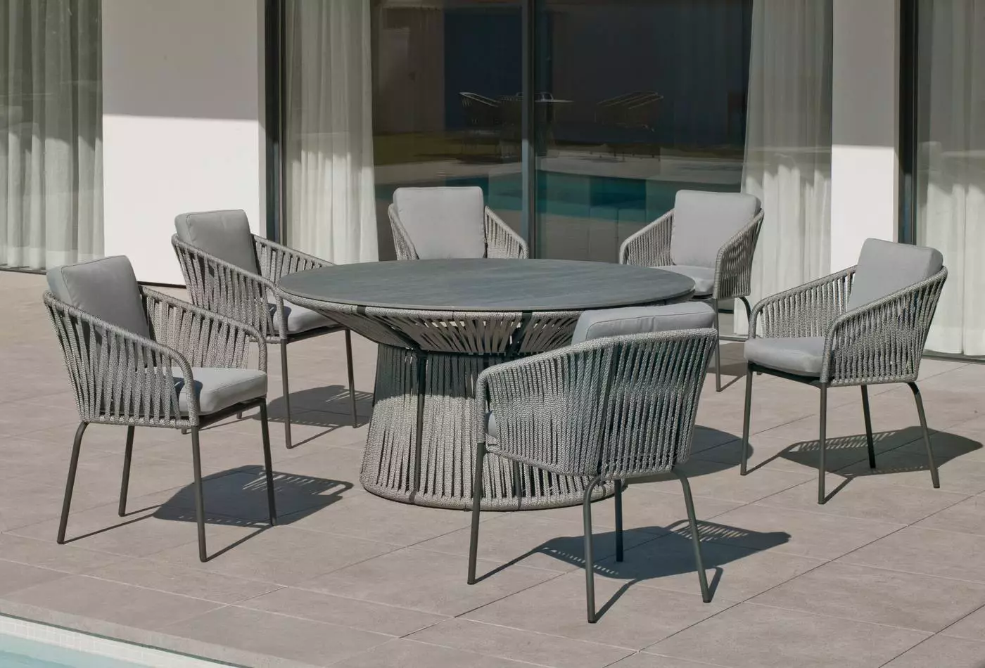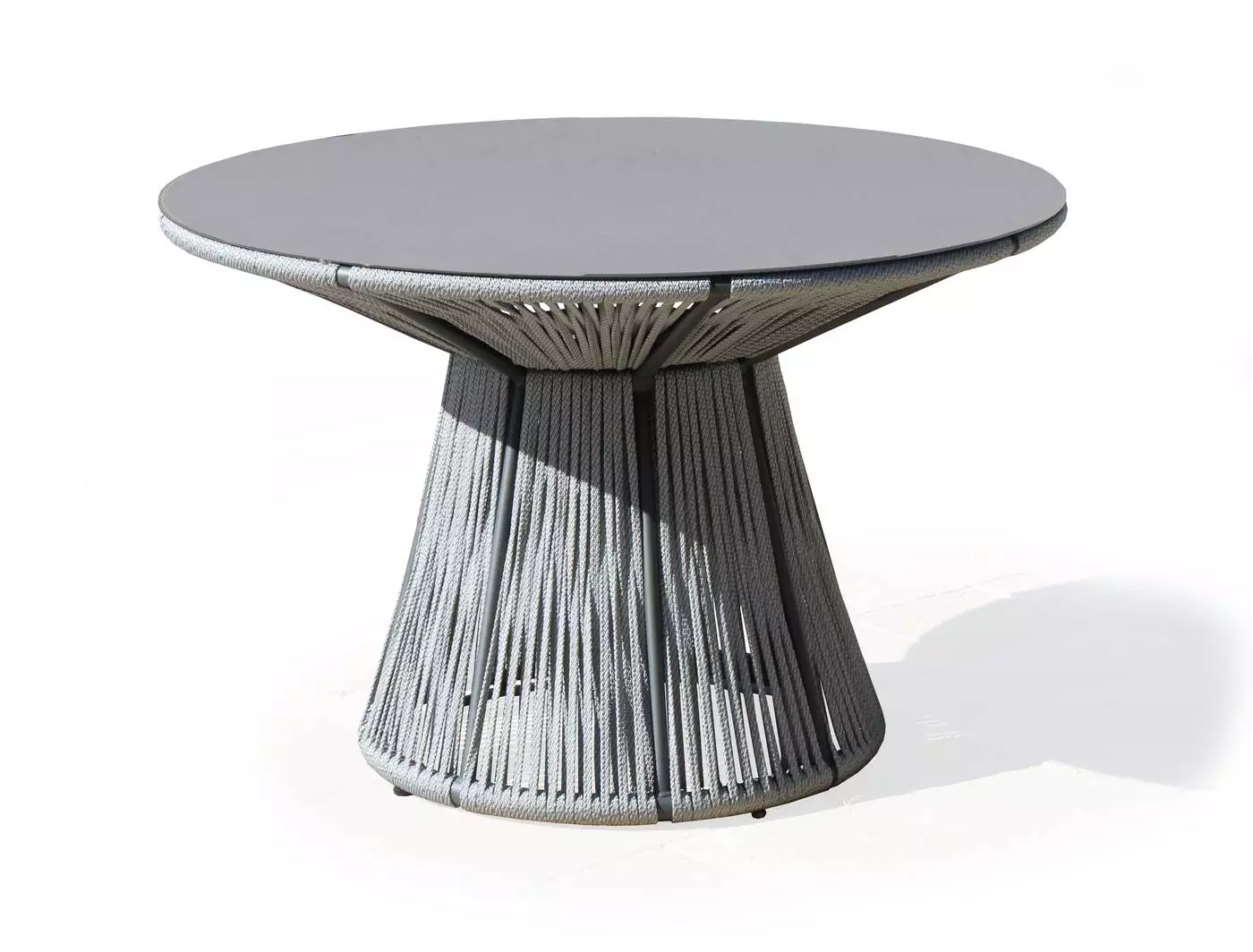 La estructura de aluminio esta mesa se complementa con unos elegantes detalles de cuerda trenzada en color champagne, azul, blanco o gris antracita y tapa de HPL en varios acabados.