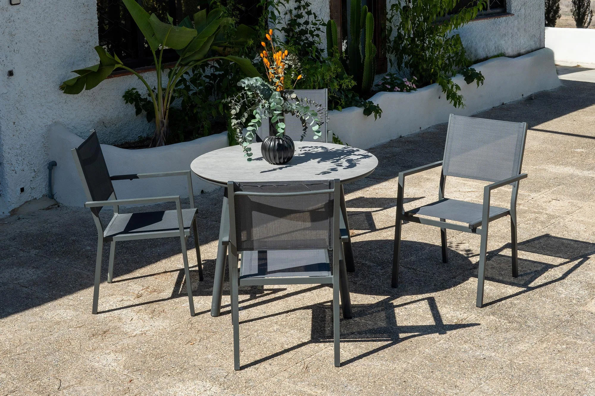 Nuestra mesa de terraza redonda de 100 cm. fabricada en aluminio y con tablero laminado en HPL es una excelente elección para quienes buscan una opción duradera y estéticamente atractiva para su espacio exterior. Este tipo de mesa combina la robustez del aluminio con la resistencia y belleza del HPL (laminado decorativo a alta presión), lo que la hace ideal para el uso en jardines y terrazas.Esta mesa de centro, de líneas rectas y depuradas, de aspecto moderno y vanguardista, podrás combinarla con cualquiera de nuestras sillas o sillones de exterior logrando crear un espacio único en tu jardín o terraza.Si te gusta el diseño de esta mesa, pero la necesitas en un diámetro superior, te recomendamos ver nuestra mesa redonda Sumatra.Dimensiones de la mesa redonda 100 cm