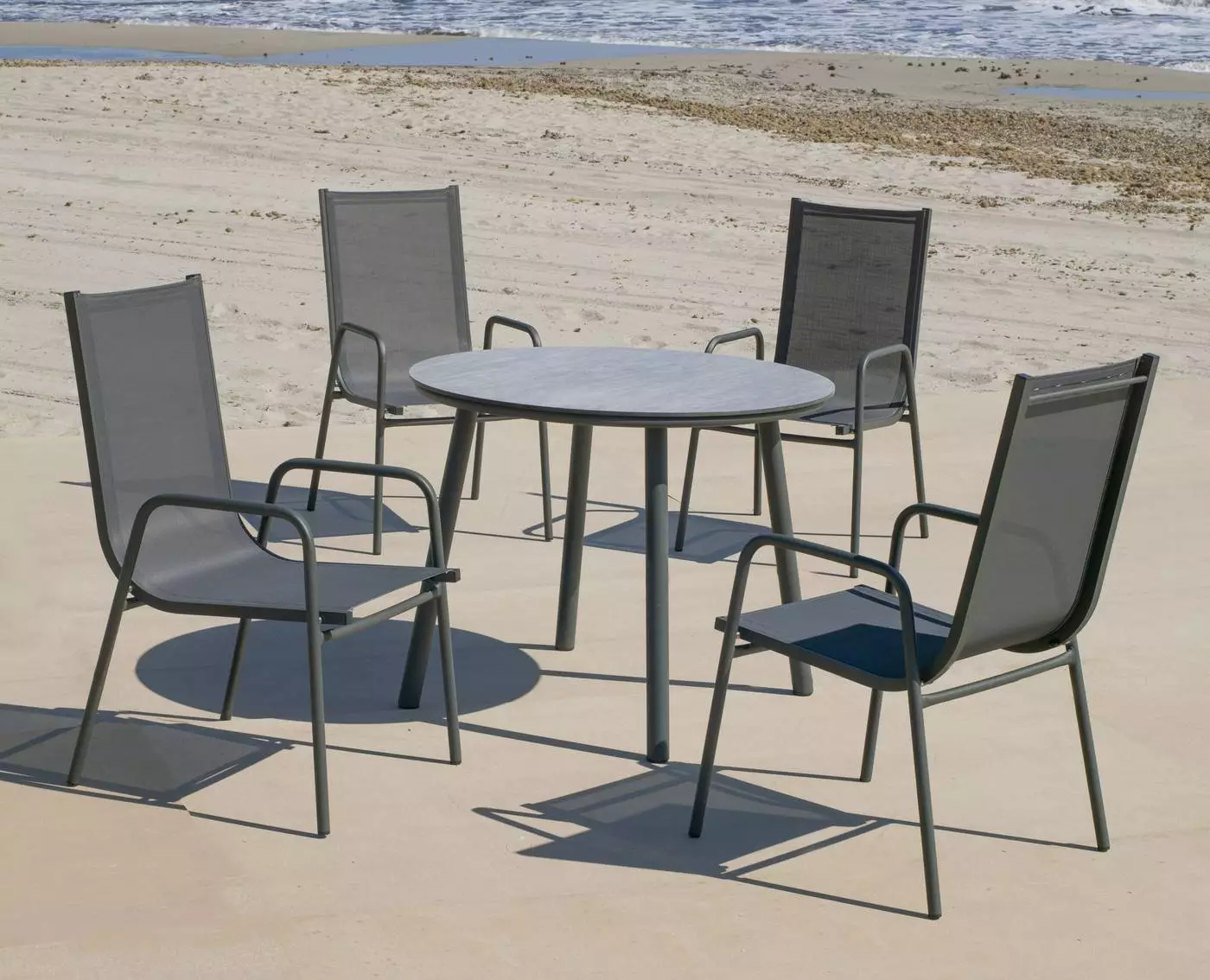 «description»: «Descubre nuestra elegante mesa de comedor redonda de 100 cm de diámetro, una opción duradera y moderna para tu espacio exterior.»