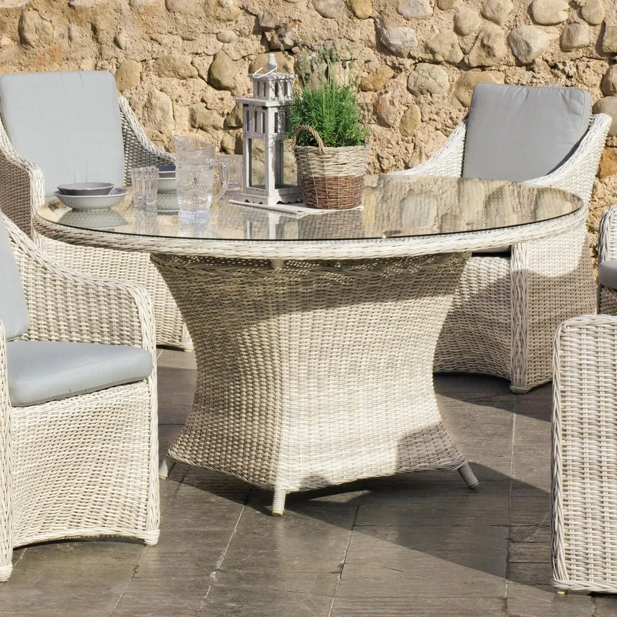 Elegante mesa de comedor redonda de ratán fabricada para todo aquel que busque calidad, una esmerada elaboración y un especial cuidado en todos los detalles. Comercializamos este modelo en tres diámetros distintos; 120, 150 y 180 cm.