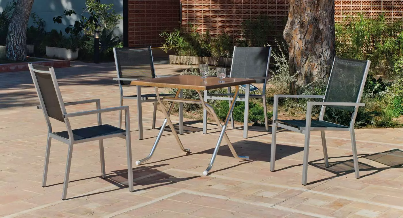 *Sillas jardín apilables no incluidasTambién puede ver nuestra mesa plegable de exterior cuadrada, modelo Arian