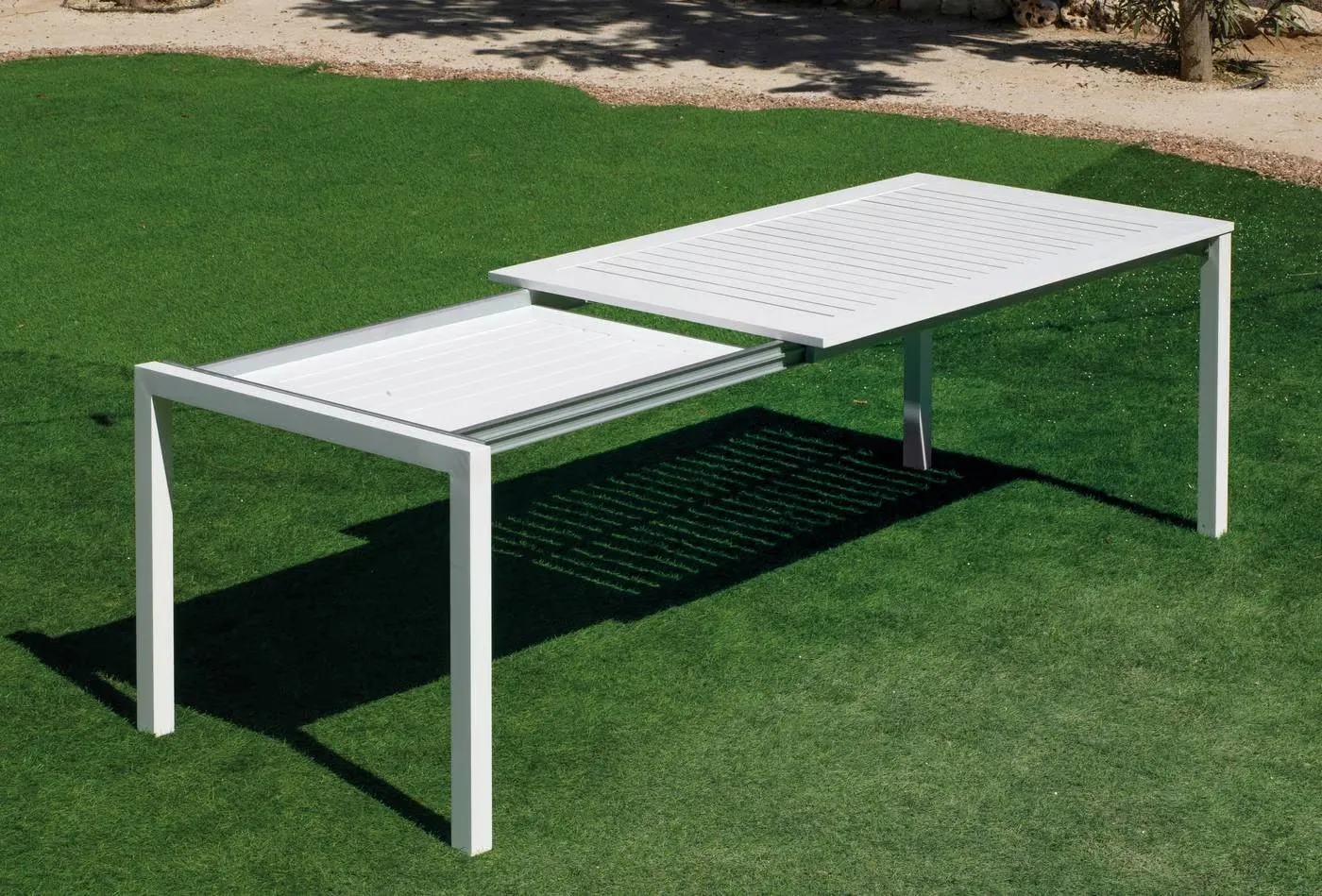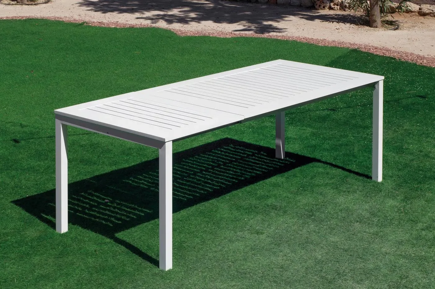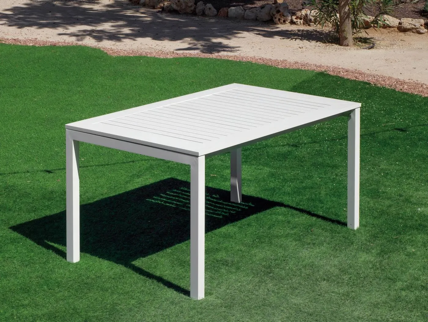 Descubre nuestra mesa extensible para exterior de aluminio, diseñada para jardines y terrazas. Con tapa de HPL resistente a rayaduras, humedad y rayos UV, ofrece dos tamaños: 150 cm (ampliable a 215 cm) y 200 cm (hasta 275 cm), perfecta para cenas íntimas o reuniones familiares.