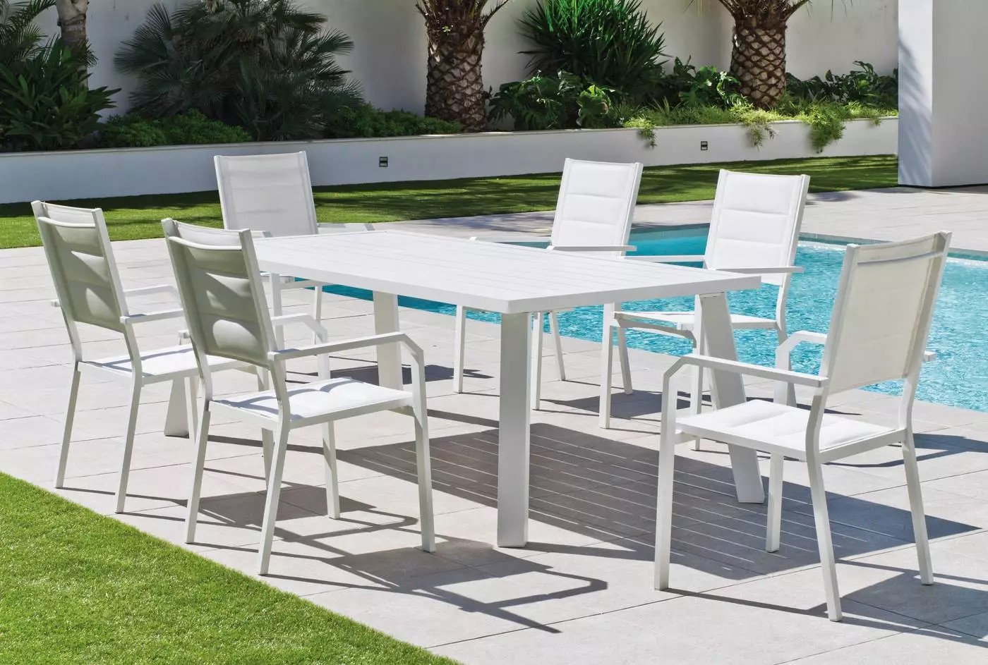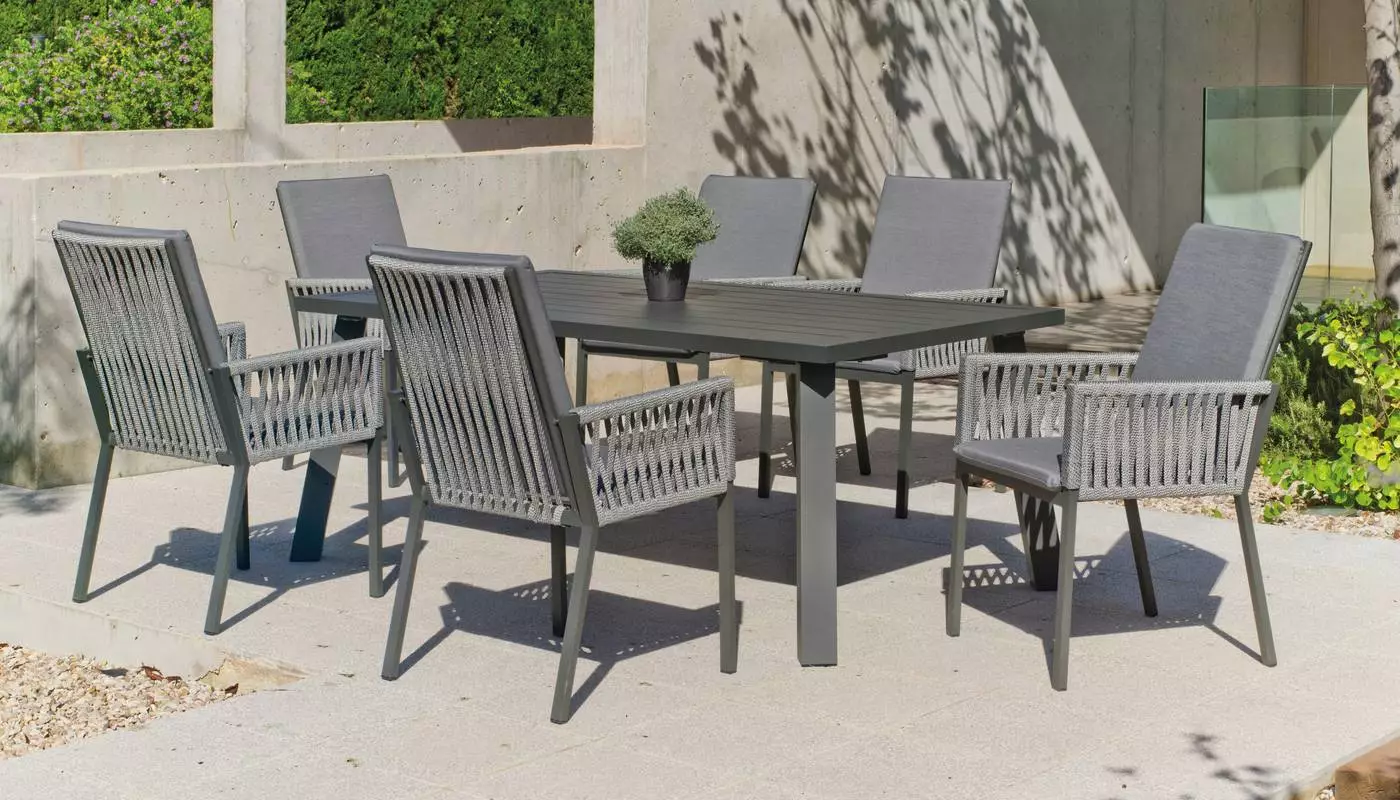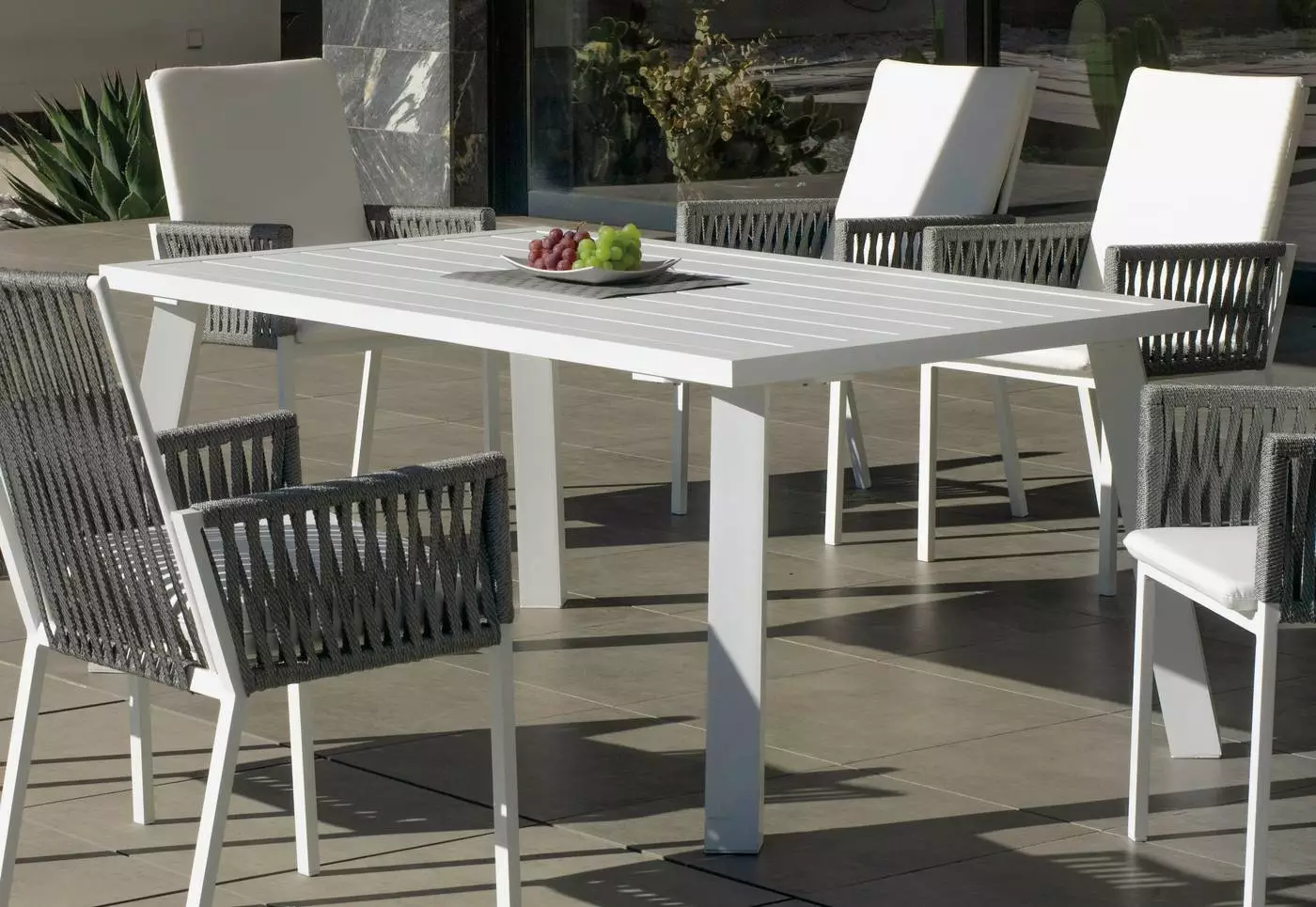 Fabricamos en aluminio y pintamos la estructura de este modelo de mesa rectangular de jardín en cuatro colores; champán, blanco, plata y gris antracita y en tres tamaños distintos. El tablero de la mesa de terraza rectangular está fabricado en lamas de aluminio. La mesa de jardín de aluminio rectangular está disponible en la medida que más se adapte a tu terraza, ya sea de 160×90 hasta 220×110. Aprovechamos este punto para recordar que fabricamos la mesa de exterior a la medida tanto de tablero como de patas que necesites.