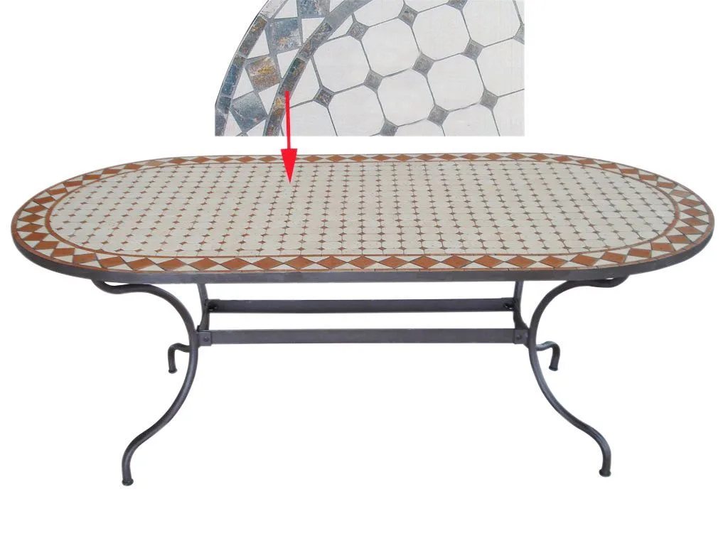 Os presentamos esta práctica mesa mosaico ovalada color bronce Modelo Montecarlo, con tablero de 200×100 cm. Una mesa muy resistente fabricada para soportar las condiciones adversas como el sol y la lluvia, así como los rigores del uso diario, ideal para jardín o terraza. Gracias a su amplia superficie permite albergar hasta 8 personas.Esta mesa mosaico ovalada de elegante diseño, creará un ambiente mediterráneo en tu hogar. Su patrón de mosaico, de figuras geométricas, hecho a mano es particularmente único y le darán un estilo personal a tu terraza o jardín.Gracias a su gran estabilidad, esta mesa no supondrá ningún problema, se caracteriza por su durabilidad y también es resistente a la intemperie, por lo que es ideal para un uso prolongado en el exterior.La estructura de esta mesa es de acero forjado, con menos porosidad y mayor resistencia que cualquier otro tipo de acero. El tablero de mosaico cerámico es resistente a la humedad y al calor.Dimensiones