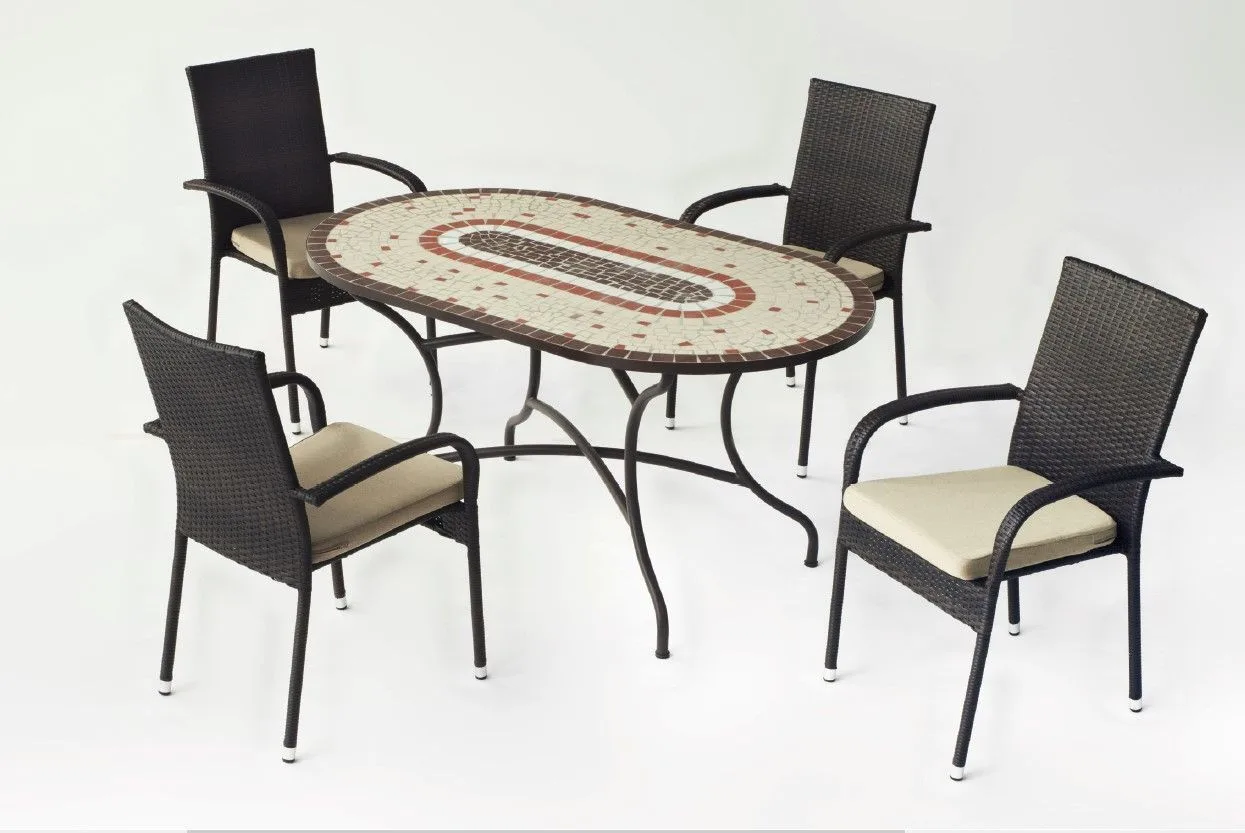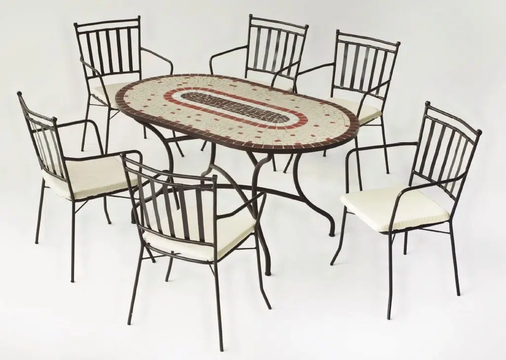 Os presentamos esta práctica mesa de mosaico ovalada, pintada en color bronce Modelo Malaya, con tablero en dos tamaños distintos; 200 x 100 y 150×90 cm. Una mesa muy resistente fabricada para soportar las condiciones adversas como el sol y la lluvia, así como los rigores del uso diario, ideal para jardín o terraza.Esta mesa mosaica ovalada de cerámica de elegante diseño, creará un ambiente mediterráneo en tu hogar. Su patrón de mosaico, de figuras geométricas, hecho a mano, es particularmente único y le darán un estilo personal a tu terraza o jardín.Gracias a su gran estabilidad, esta mesa no supondrá ningún problema, se caracteriza por su durabilidad y también es resistente a la intemperie, por lo que es ideal para un uso prolongado en el exterior.La estructura de esta mesa exterior de cerámica de acero forjado, con menos porosidad y mayor resistencia que cualquier otro tipo de acero. El tablero de mosaico cerámico es resistente a la humedad y al calor.Te una estupenda mesa de jardín y forja, con nuestros sillones de forja para jardín, modelo Shifa.Dimensiones