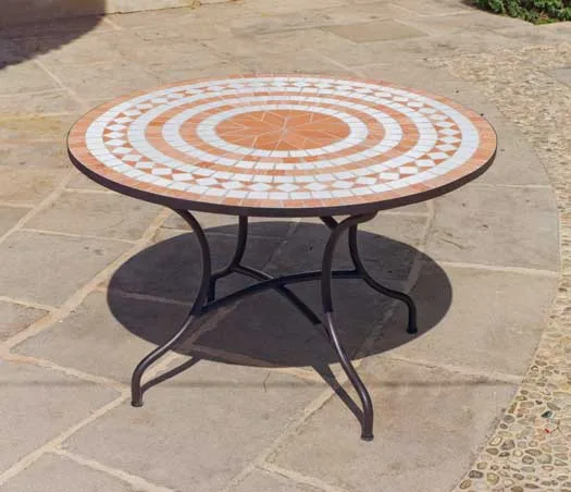 Os presentamos esta práctica mesa mosaico redonda color bronce Modelo Dogliani, con tablero circular mosaico de Ø 120 cm, ideal para jardín o terraza.