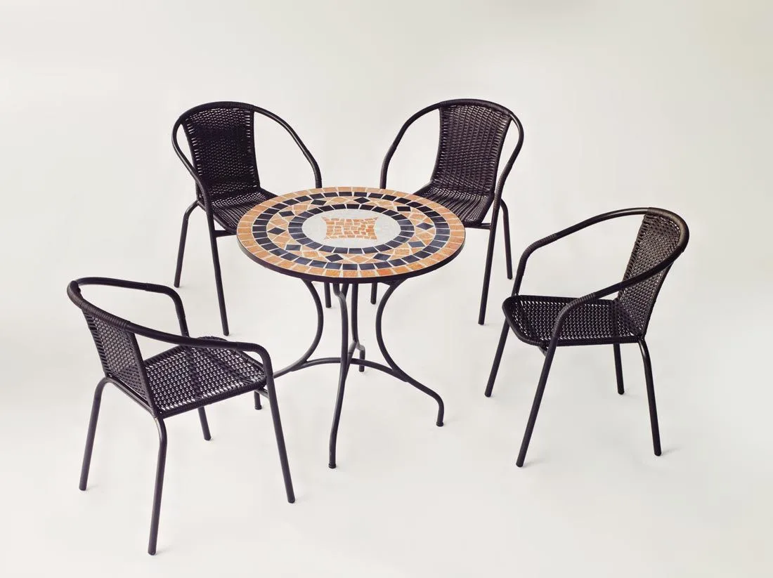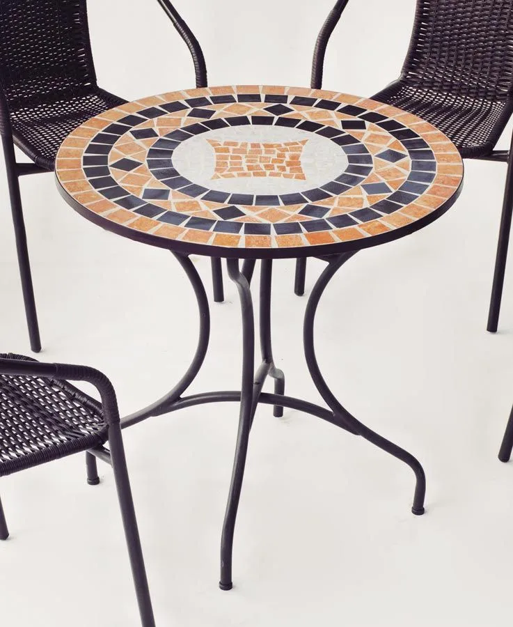 Os presentamos esta práctica mesa mosaico redonda color bronce Modelo Soria, con tablero circular mosaico de Ø 75 cm, ideal para exterior.Esta mesa mosaico redonda creará un ambiente mediterráneo en tu hogar. Su patrón de mosaico hecho a mano es particularmente único. Tanto en el interior como en el exterior, gracias a su diseño hará que esta mesa de jardín sea un punto de atracción en tu casa.Gracias a su gran estabilidad, esta mesa no supondrá ningún problema, se caracteriza por su durabilidad y también es resistente a la intemperie, por lo que es ideal para un uso prolongado en el exterior.La estructura de esta mesa es de acero forjado, con menos porosidad y mayor resistencia que cualquier otro tipo de acero. El tablero de mosaico cerámico es resistente a la humedad y al calor.Dimensiones