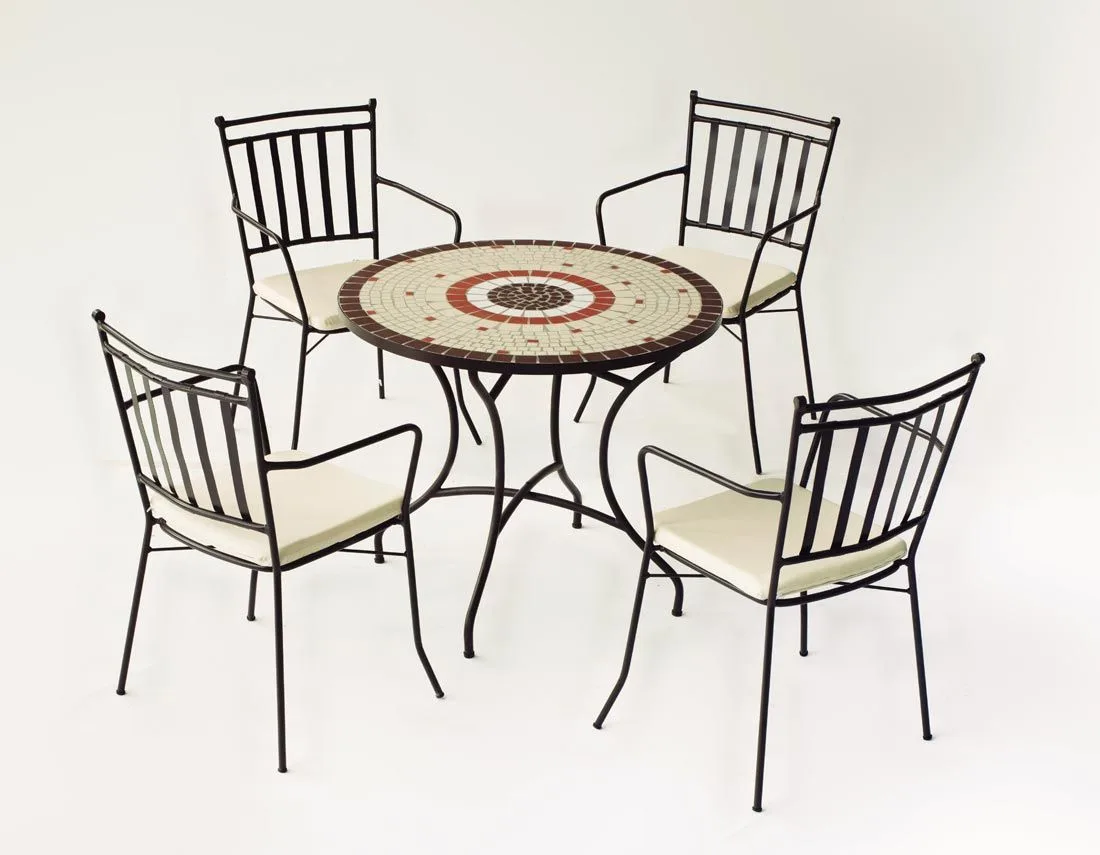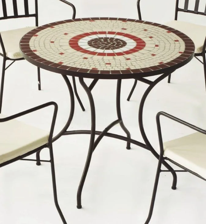 Os presentamos esta práctica mesa mosaico redonda Malaya, con tablero circular mosaico de Ø 90 cm. en color marrón con tonos rojos, ideal para terrazas de reducidas dimensiones.