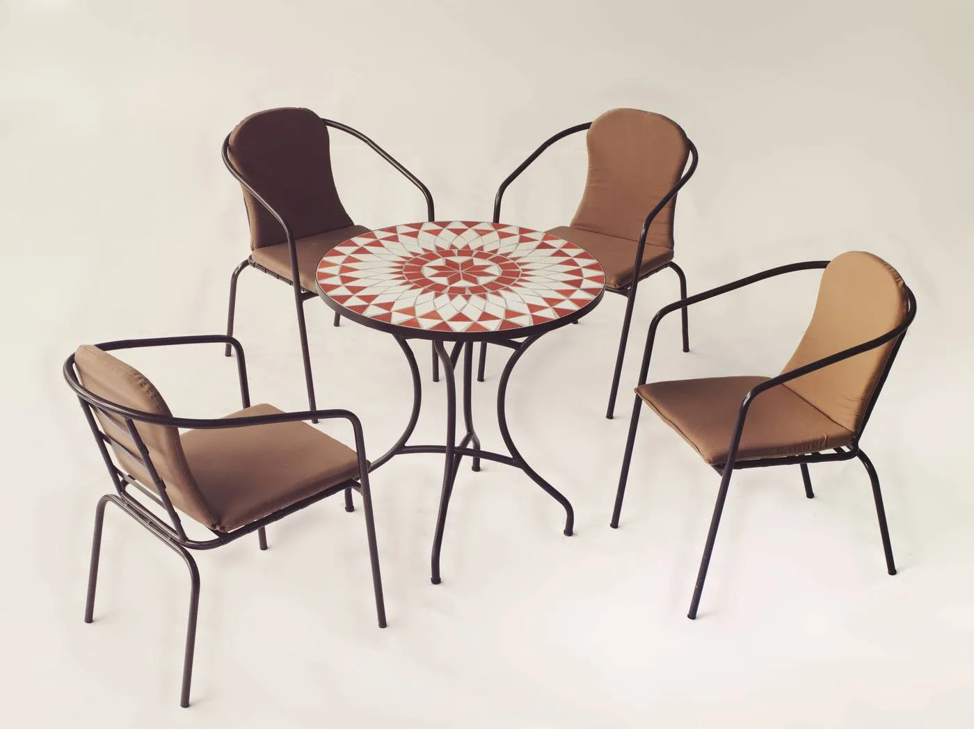 Os presentamos esta práctica mesa mosaico redonda color bronce Modelo Neypal, con tablero circular mosaico en varios diámetros; 60, 75 y 90 cm, ideal para jardín o una terraza de pequeñas dimensiones.