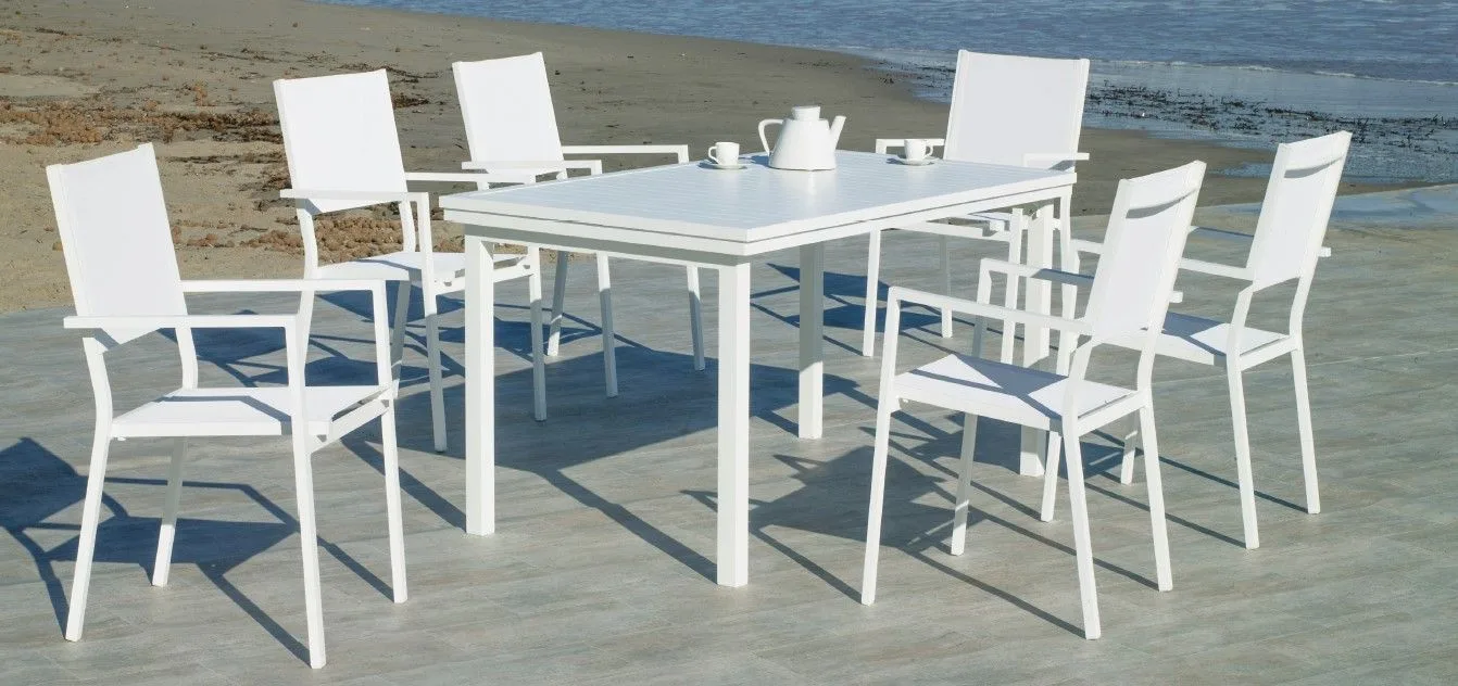 Esta elegante mesa plegable de comedor para jardín fabricada en aluminio Neferti, te ofrecerá un lugar relajado y cómodo en tu jardín para que puedas disfrutar del tiempo libre con tu familia y amigos.Su limpio y original diseño, otorgan a esta mesa plegable modernidad y elegancia. Diseñada para soportar las condiciones adversas como el sol y la lluvia, así como los rigores del uso diario. La fabricamos en dos colores distintos; blanco y gris antracita.En la fabricación de esta mesa se han utilizado las mejores materias primas que la hacen muy resistente y duradera. Estructura y uniones fabricadas en aluminio extrusado de alta calidad y no reciclado. Los tubos de aluminio que la forman están perfectamente lijados para eliminar cualquier imperfección o irregularidad en las juntas. Así mismo, dichos tubos están especialmente pulidos para abrir los poros del aluminio y facilitar la fijación de la pintura. Las patas llevan tacos para evitar rallar el suelo y reducir el ruido producido con el movimiento. La tapa está formada con tablero lamas de aluminio.Medidas