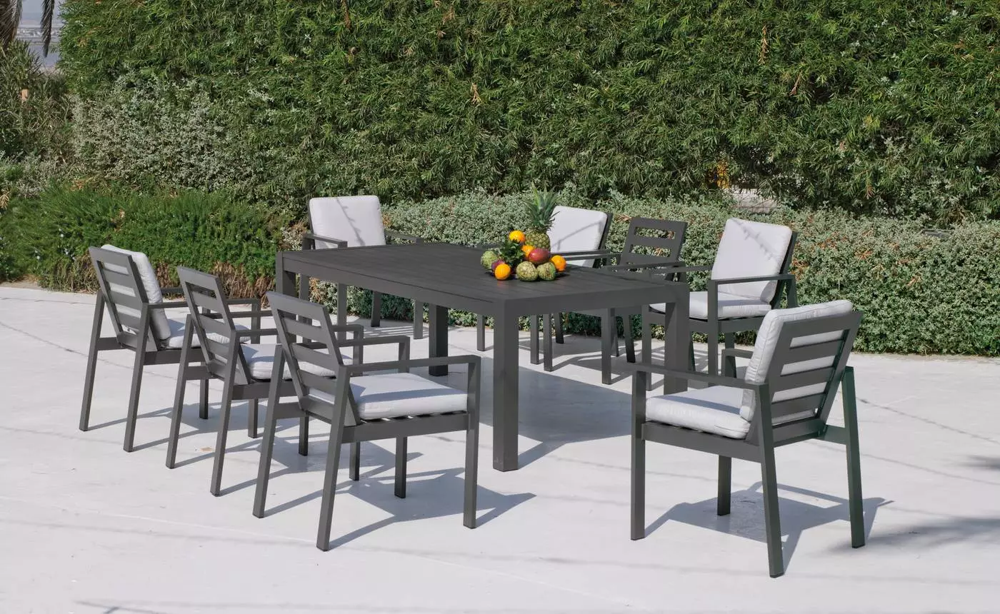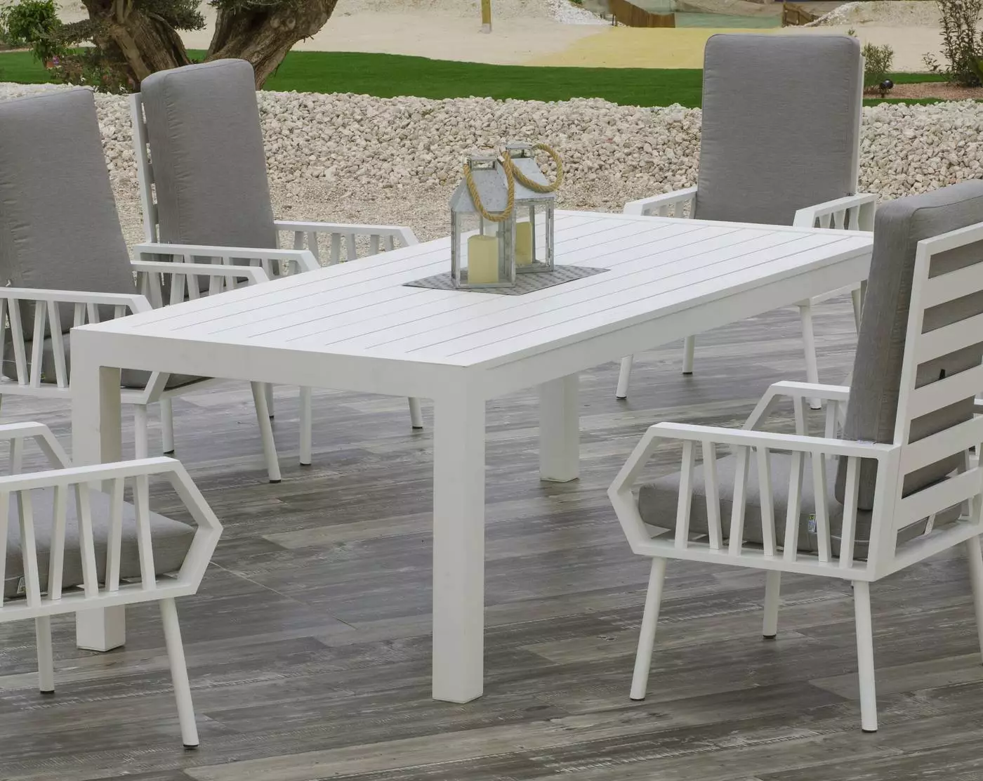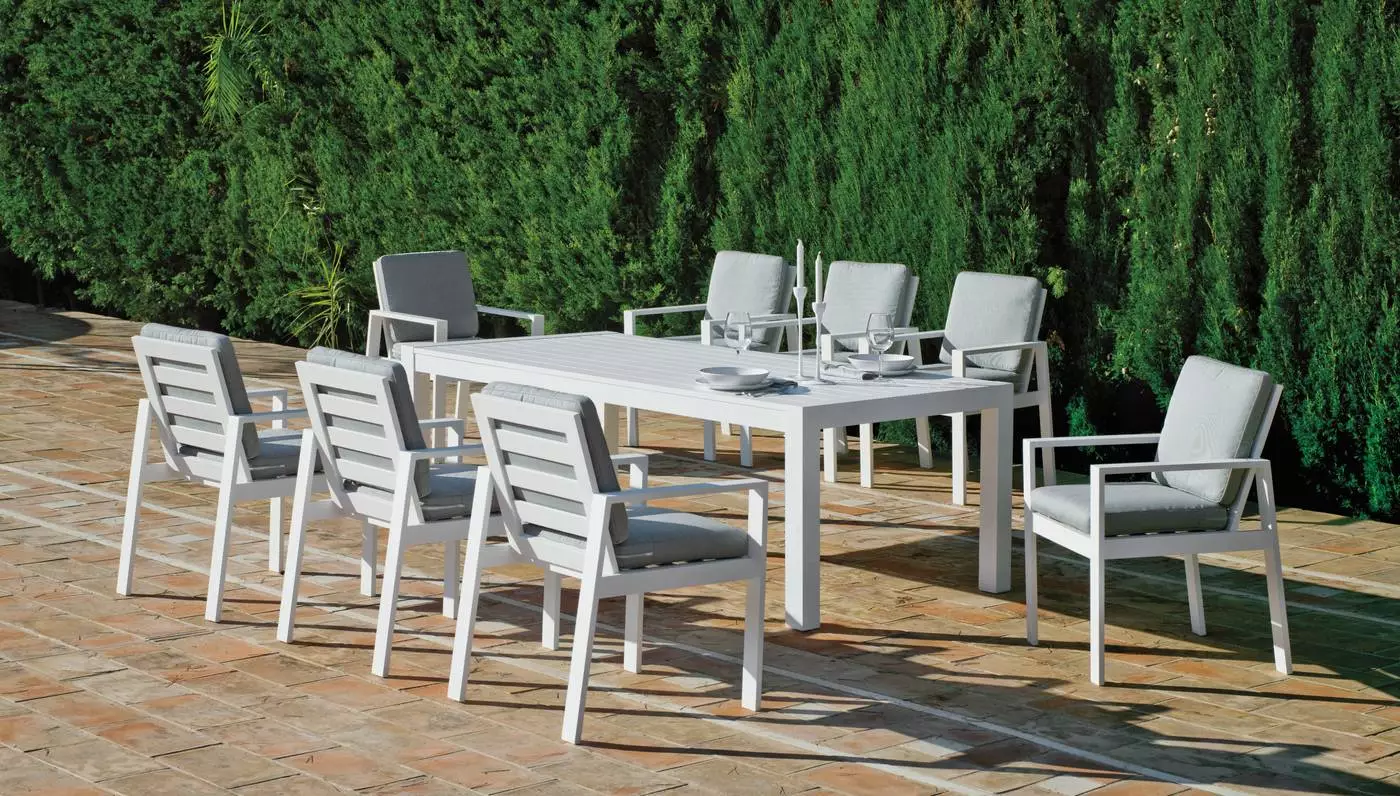 Su limpio y original diseño, otorgan a esta mesa de comedor modernidad y elegancia. Diseñada para soportar las condiciones adversas como el sol y la lluvia, así como los rigores del uso diario. Fabricamos la estructura en tres colores distintos; champagne, blanco y gris antracita y en dos dimensiones.