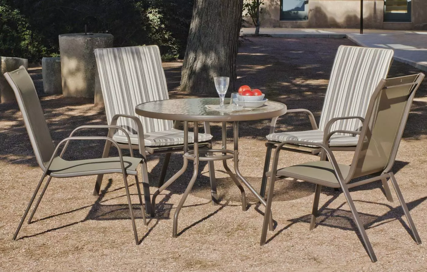 Esta elegante mesa de jardín de 90, fabricada de acero lacado en color bronce Macao, que te ofrecerá un lugar relajado y cómodo en tu jardín para que puedas disfrutar del tiempo libre con tu familia y amigos.Su limpio y original diseño, otorgan a esta mesa de jardín redonda de 90 cm modernidad y elegancia. Diseñada para soportar las condiciones adversas como el sol y la lluvia, así como los rigores del uso diario.Gracias a su diseño, nuestra mesa de terraza de 90 cm, modelo Macao encaja en todo tipo de ambientes de exterior. Disfrutar de preciosos atardeceres está a la vuelta de la esquina ¿a qué esperas para conseguir la tuya? No pierdas esta fantástica oportunidad, es la mesita de jardín redonda de 90 cm, perfecta para darle un toque vintage a tu jardín o terraza.En la fabricación de esta mesa se han utilizado las mejores materias primas que la hacen muy resistente y duradera. La estructura de la mesa y sus uniones están fabricadas en acero lacado en color bronce que se complementa con un tablero de cristal templado de seguridad con agujero central para poder incorporar una sombrilla o parasol,  imagínate una comida entre amigos bajo la sombra que te proporcionaría nuestro parasol de aluminio con manivela modelo Caracas.Dimensiones