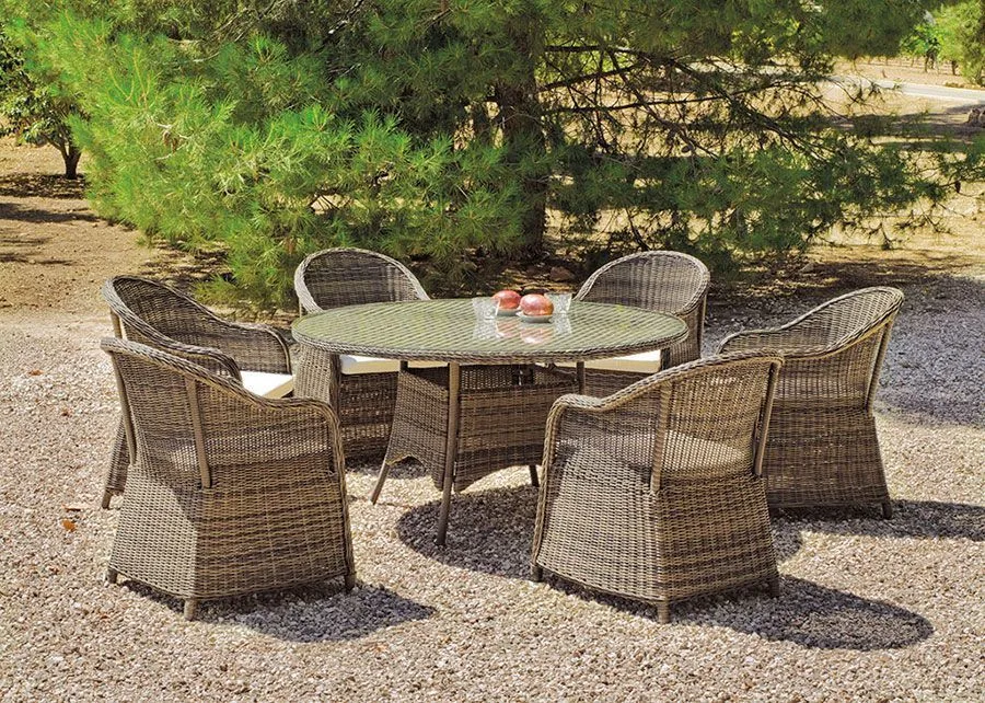 ¿Te gusta comer o cenar al aire libre? nuestra mesa redonda para jardín en ratán color natural envejecido Amanda será la opción perfecta ya que está fabricada para soportar las condiciones adversas como el sol y la lluvia, así como los rigores del uso diario, idónea para jardín o terraza. Fabricamos este modelo de mesa en dos diámetros distintos; 120 y 150 cm. Ideal para acoger hasta 8 comensales.En la fabricación de esta mesa se han utilizado las mejores materias primas que la hacen muy resistente y duradera. Estructura y uniones fabricadas de aluminio reforzado de gran grosor para obtener una mesa resistente y con alta durabilidad. Las patas terminan con protección de aluminio y llevan tacos de goma  para evitar rallar el suelo y reducir el ruido producido con el movimiento.Esta estructura está cubierta con ratán sintético de alta calidad, se caracteriza por su resistencia y robustez y su fácil limpieza.  El ratán es un material plástico de polipropileno que imita al ratán natural y que puede resistir más en el tiempo gracias a su reforzado de fibra de vidrio capaz de estar, pasados unos años, tal y como el primer día de su compra.Incluye tapa de cristal templado de seguridad de 5 mm. transparente, que se mantiene fijo gracias a cuatro ventosas. Se trata de un cristal con una protección adicional para proteger la fibra, que evita el efecto lupa y no deja pasar el calor de los rayos del sol, ofreciendo una protección a la fibra para evitar su rápido deterioro.Medidas