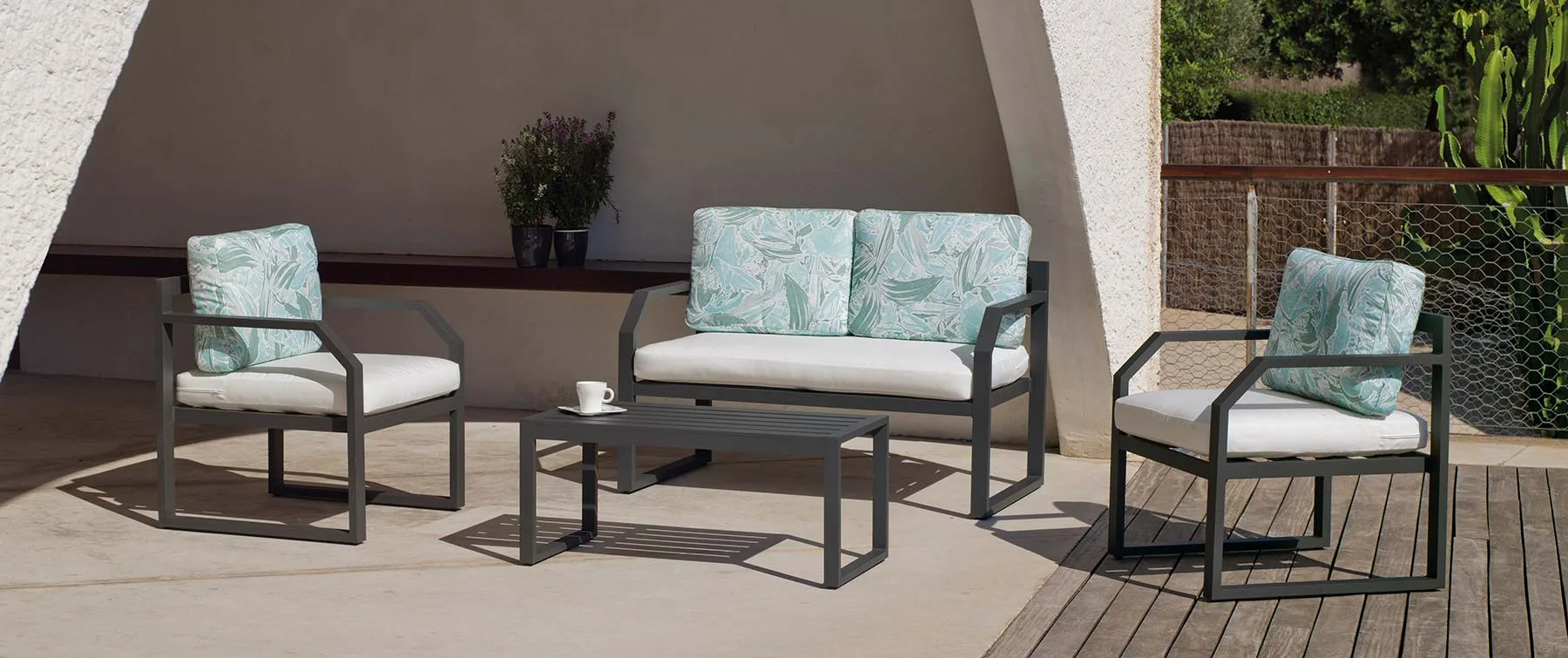 Puedes ver este conjunto de exterior con sofá de 3 plazas, nuestro Conjunto Elsa.