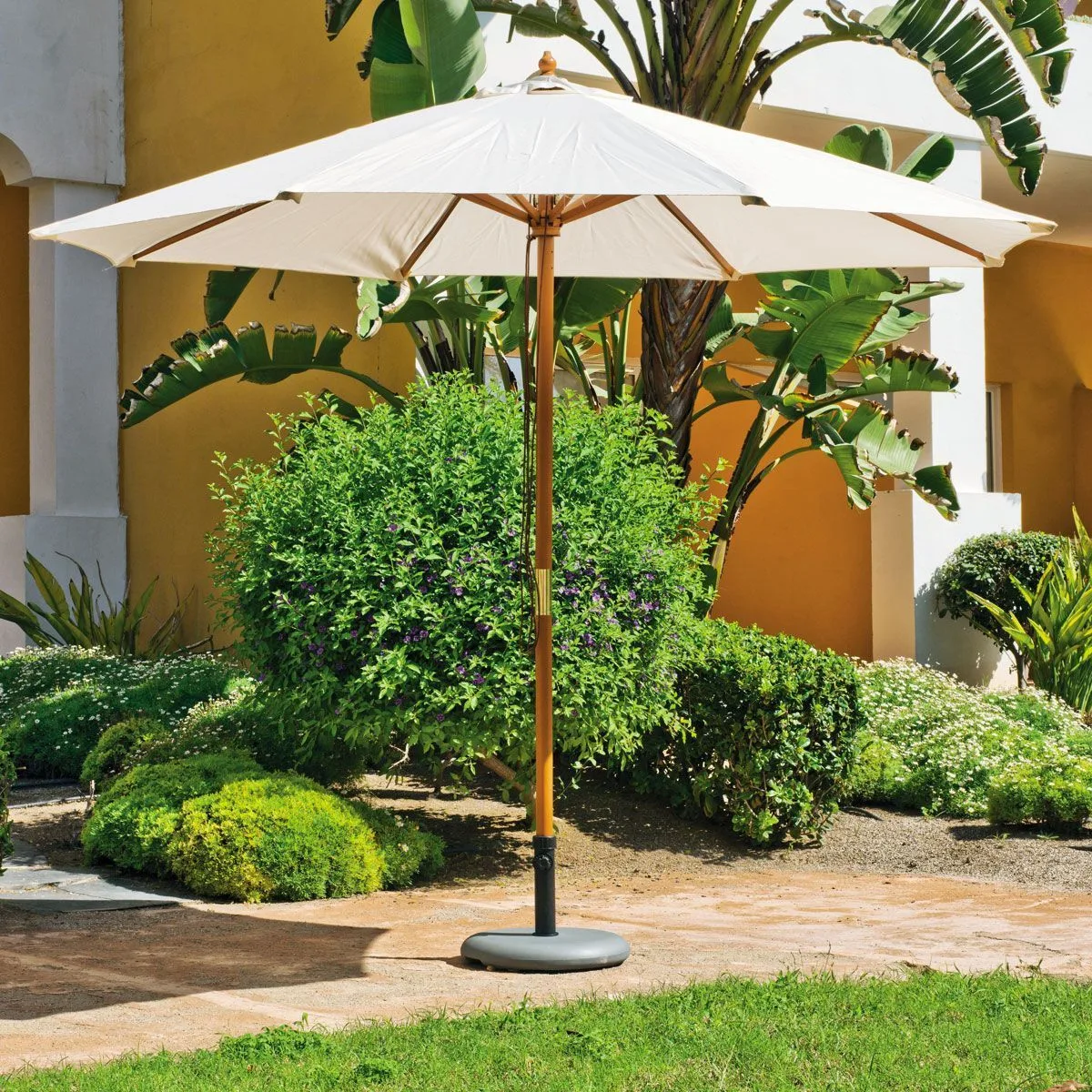 Parasol redondo con mástil central de madera maciza de haya modelo Lux, varillas del mismo material y tela de poliéster en color crudo. Se abre y cierra con polea de forma cómoda y segura.