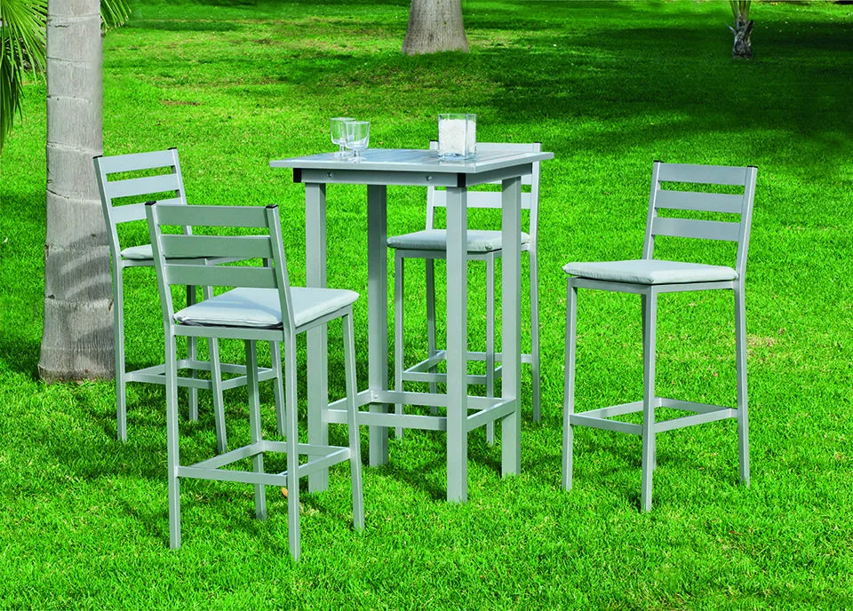 Fabricado con precisión en aluminio resistente a la intemperie, cada pieza de este set garantiza una durabilidad excepcional sin sacrificar ni un ápice de elegancia. Los taburetes, acompañados de cojines de Dralón, brindan un confort supremo mientras te relajas con amigos o familiares en tu patio, jardín o terraza. La mesa alta, ofrece una superficie resistente y fácil de limpiar para tus momentos de entretenimiento al aire libre.