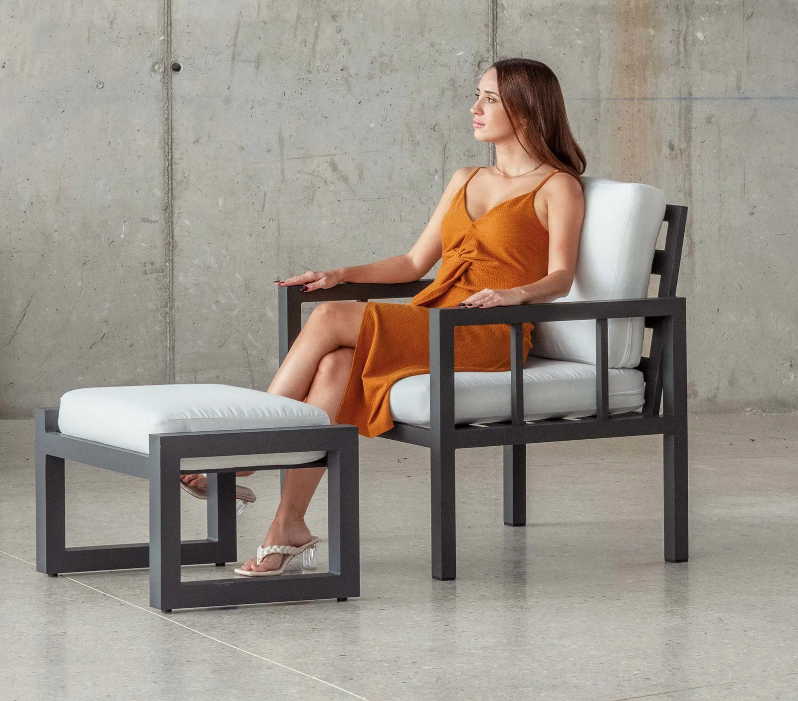 Elige aquí abajo, primero el color de la estructura de aluminio y, después, el tipo de tapicería para el asiento y respaldo.