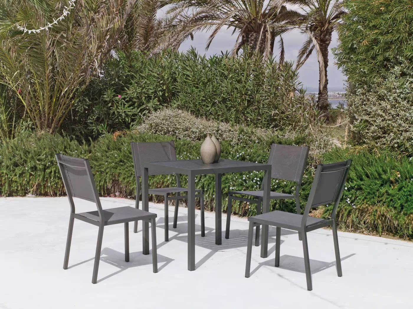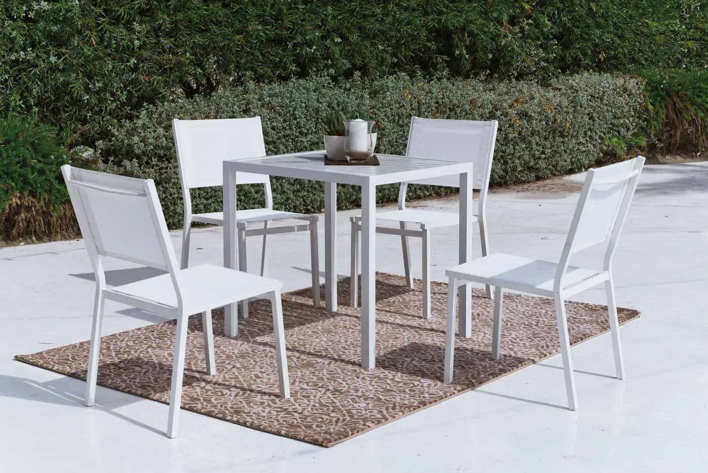Su limpio y original diseño, otorgan a esta silla apilable de jardín tanto modernidad como elegancia. Especialmente diseñado para soportar las condiciones adversas como el sol y la lluvia, así como los rigores del uso diario. Fabricamos la estructura en seis colores distintos; champagne, blanco, marrón, negro, plata y gris antracita.En la fabricación de esta silla de terraza sin brazos, se han utilizado las mejores materias primas que la hacen muy resistente y duradera. Estructura y uniones fabricadas en aluminio extrusado de alta calidad y no reciclado. Los tubos de aluminio que la forman están perfectamente lijados para eliminar cualquier imperfección o irregularidad en las juntas. Así mismo, dichos tubos están especialmente pulidos para abrir los poros del aluminio y facilitar la fijación de la pintura. Las patas llevan tacos para evitar rallar el suelo y reducir el ruido producido con el movimiento.Los asientos y respaldos están fabricados con textilene, entre sus principales características destacamos: