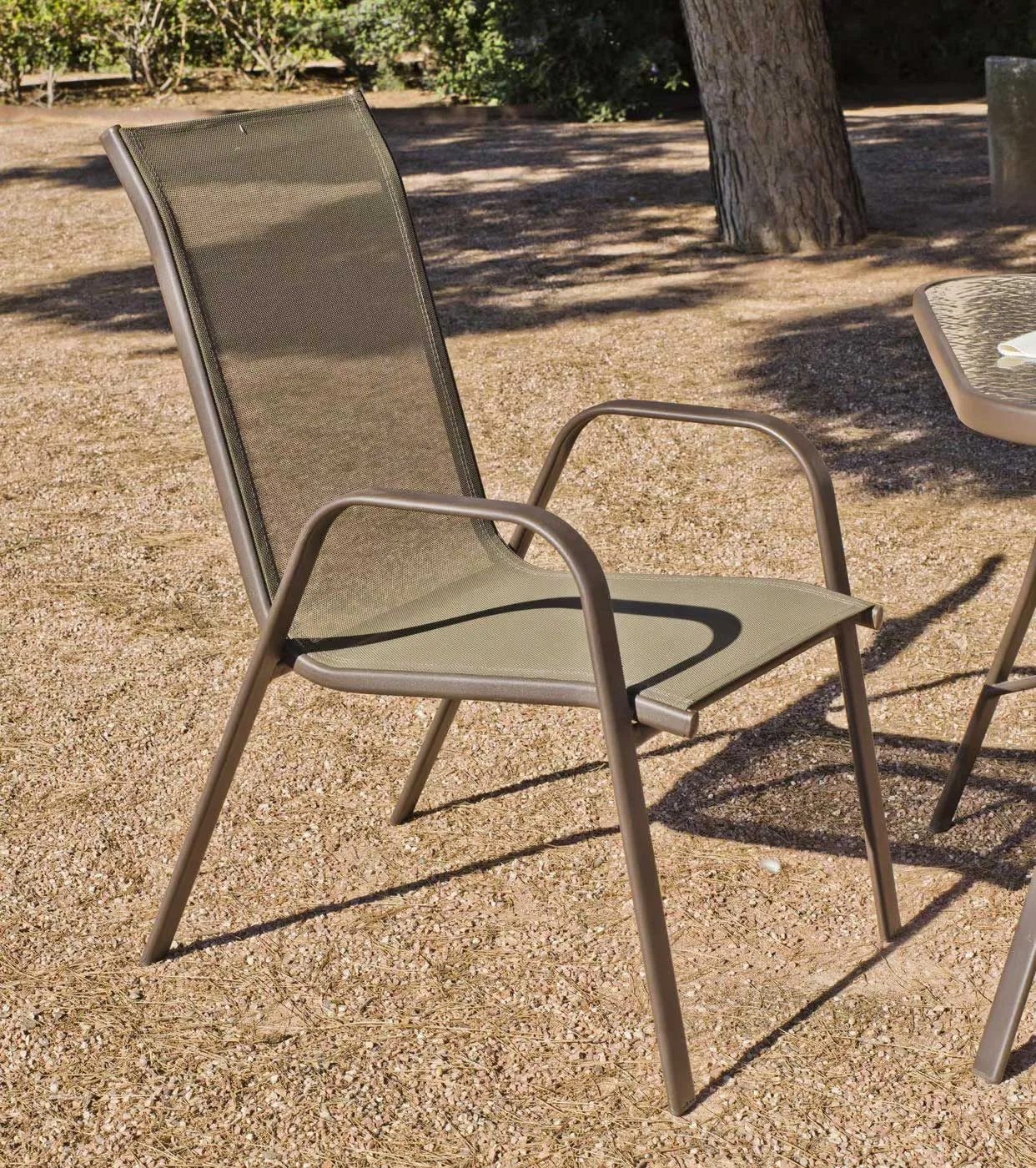 Nuestro sillón para balcón pequeño es apilable y con brazos. Esta silla de balcón está pintada en color bronce y su asiento de textilene en color marrón. Este sillón de balcón destaca por su diseño elegante y resistente. Los brazos curvos le dan un toque moderno y sofisticado, mientras que el asiento de textilene es resistente al clima y al desgaste.